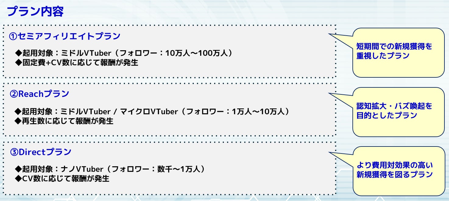 当社とサイバースターが連携することで、企業には効果的で費用対効果の高いプロモーション手法を提供し、VTuberには成果報酬型の新たなマネタイズ機会を創出します。これにより、企業とVTuber双方にとって持続的な成長を支え、より多様なマーケティングの可能性を広げてまいります。