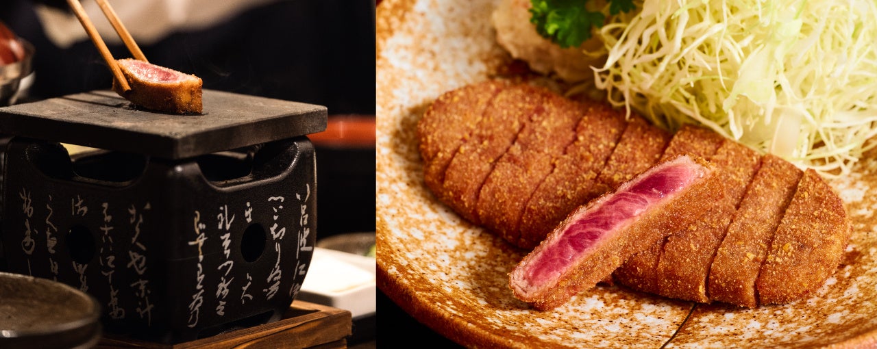 SNSで世界中に広がり続ける『牛かつ もと村』の人気。その魅力は味だけでなく店舗での体験にあります。提供されるのは、ミディアムに揚げた牛かつ。目の前の石盤でお好みの加減まで炙り、岩塩や特製の山わさびソースでお召し上がりいただきます。
