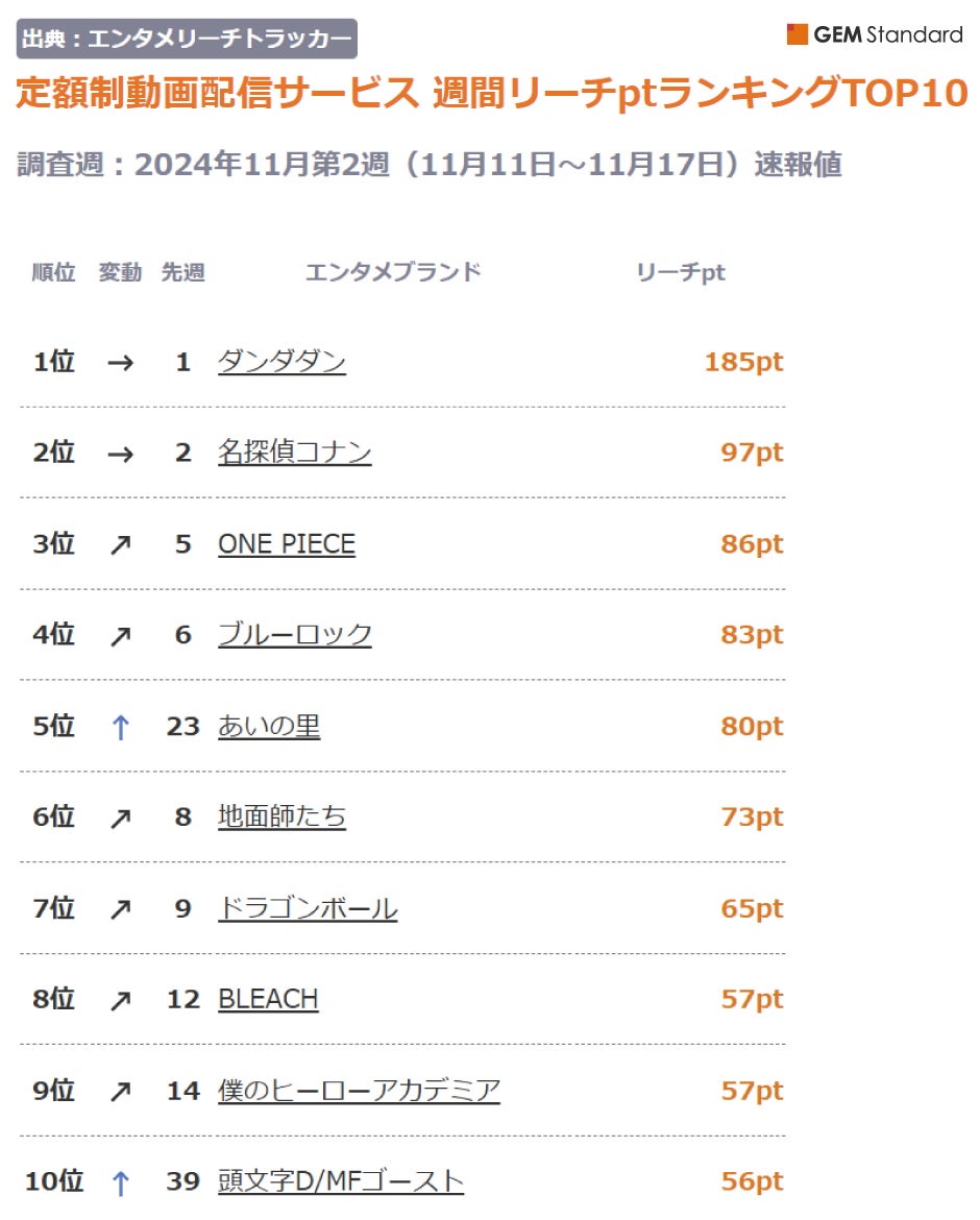 『ダンダダン』首位を独走、『あいの里』『MFゴースト』急上昇TOP10入り~定額制動画配信サービス 週間リーチptランキング(2024年11月第2週)【GEM Partners】