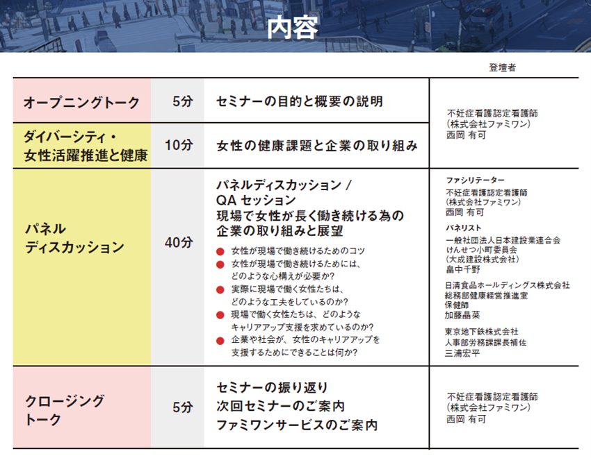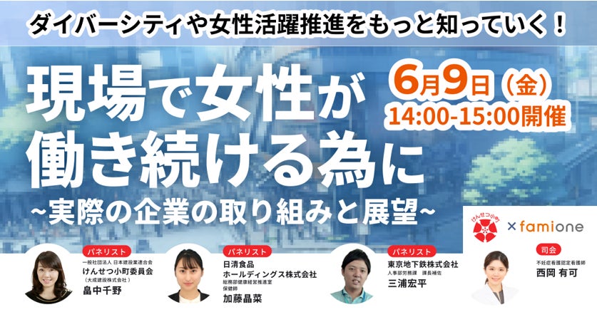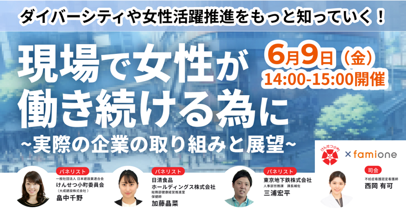 本セミナーは日本建設業連合会の「けんせつ小町」の共催ではありますが、建設業界に留まらず、その他の外で活躍する業界業種の方にパネリストとしてご登壇いただきます。女性が長く外のお仕事で働き続けるためのダイバーシティ推進やマネジメントの観点から事例発表とディスカッションを行う予定です。