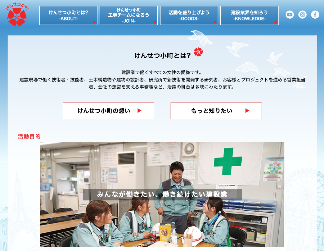 けんせつ小町は、建設業で働くすべての女性の愛称として2015年に日本建設業連合会が選定しました。けんせつ小町は、建設業に携わるすべての人が働きやすく、働き続けたいと思われる環境づくりのために、そして、けんせつ小町らしいダイバーシティ&インクルージョンの実現のために、皆で考えながら様々な活動にちゃくちゃくと取り組み続けています。