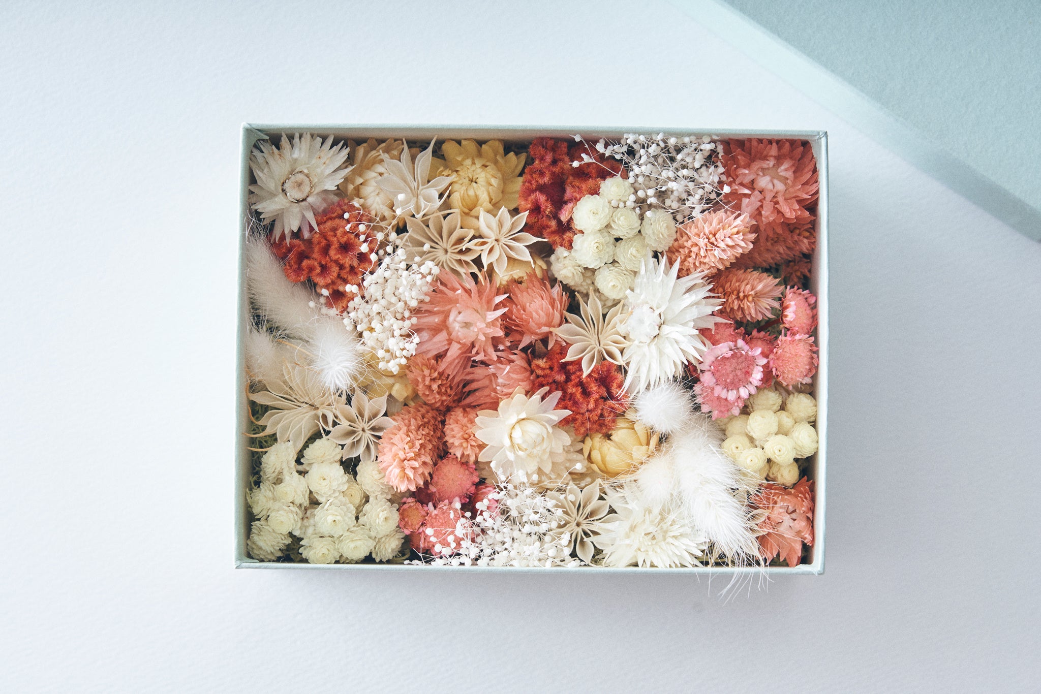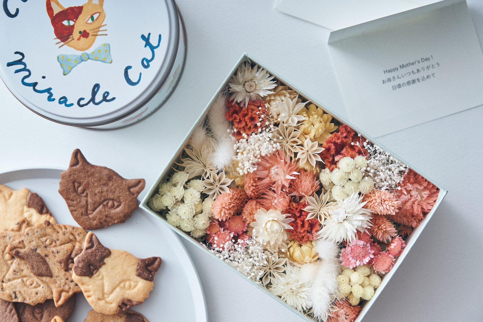 今回、笑顔をもたらすたのしいお菓子を作り続けるフェアリーケーキフェアのイメージに合わせて、guiさんに特別なボックスアレンジメントを作っていただきました。ドライフラワーやプリザーブドフラワーを使用し、ひとつひとつ丁寧に手作りされ、私たちのお菓子と一緒にお届けします。パステルカラーのボックスにギュッと詰まった色とりどりの花々を見ていると、思わず顔から笑みがこぼれてしまう、そんな幸せな気持ちにしてくれるフラワーボックスです。たくさんの感謝の気持ちを詰めて、お母さんへ「いつもありがとう」を届けてみませんか?