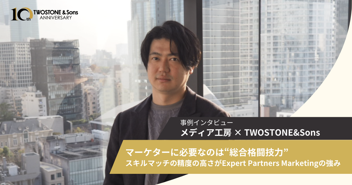 デジタルコンテンツをメインとして事業展開されているメディア工房。新規事業を行うにあたり、Web広告やクリエイティブのノウハウを持ったマーケティング領域のエキスパート人材をお探しでした。 正社員採用や広告代理店といった手段も検討した中、最終的にフリーランスマーケター活用という選択肢としてTWOSTONE&Sonsのグループが提供する「Expert Partners Marketing」を導入いただきました。高いマーケタースキル「総合格闘技力」を持った人材を求めるメディア工房様が、この決断と導入に至った過程や、活用メリットをお話いただいております。 |
