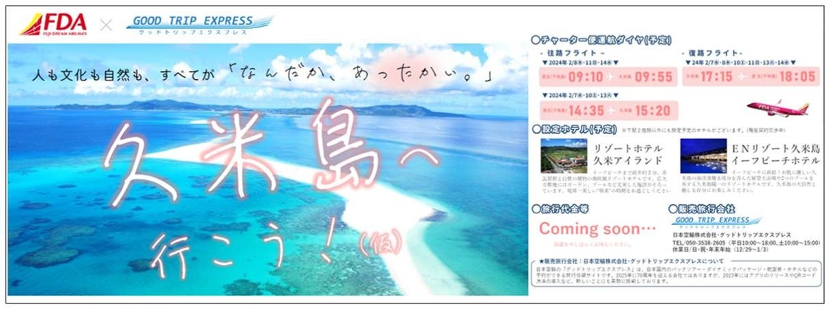 当チャーター便の運航に合わせ、双方の空港から1泊~4泊滞在できる包括旅行ツアー商品を販売します。なお、宮古島発の3出発日については、久米島への日帰り利用も可能です。