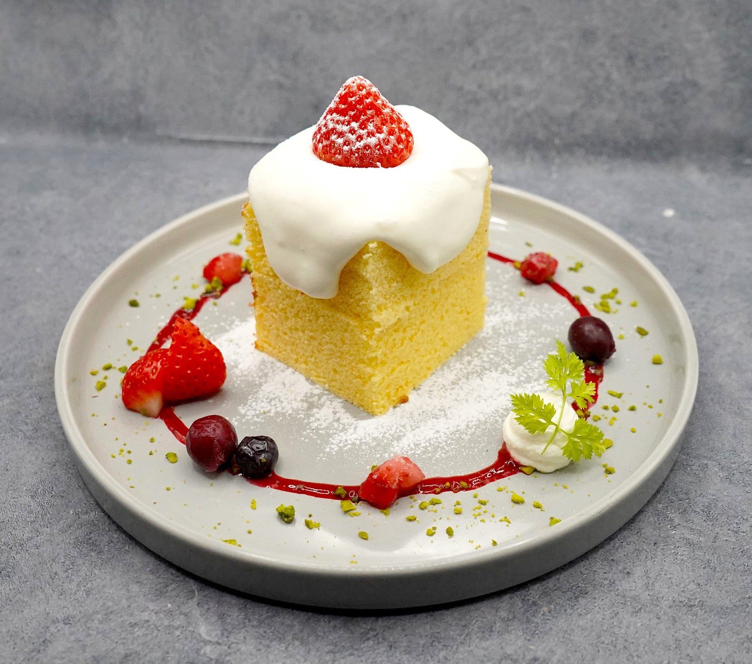 とりとしたカステラケーキにたっぷりの生クリームがとろりと流れ、中央には炎を思わせる真っ赤な