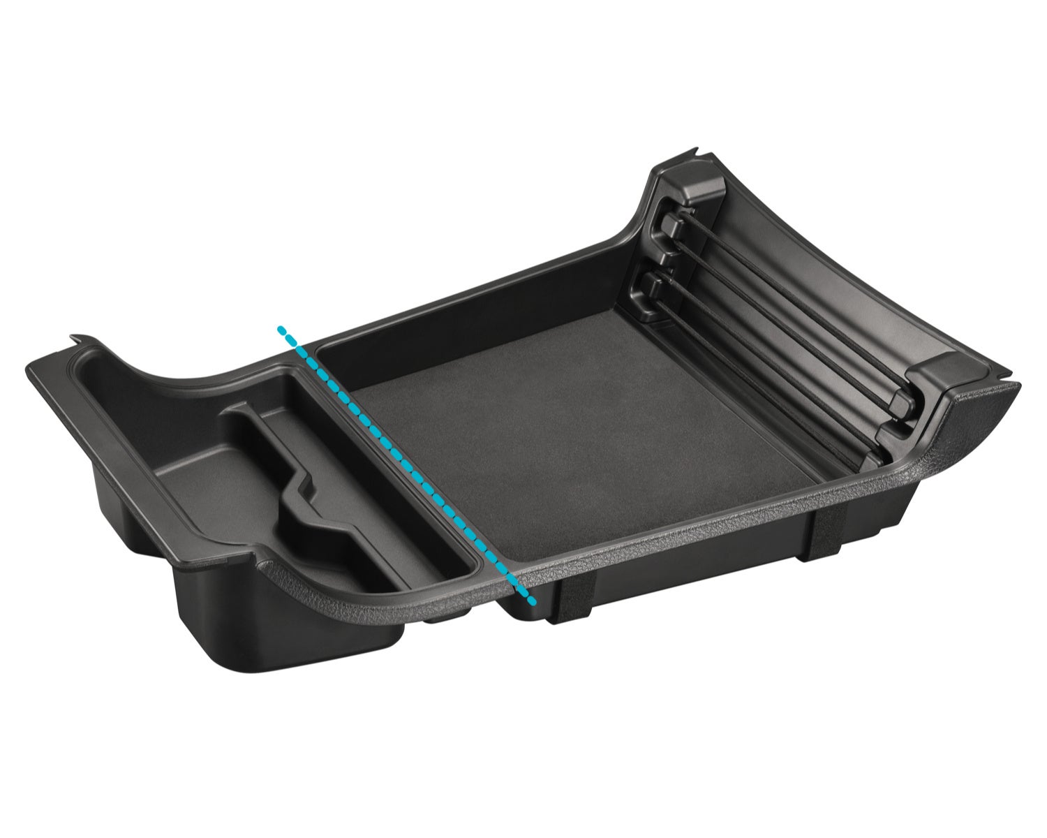 ロアコンソールは一部がシートで塞がれています。そのため、本製品はトレーを2分割することで、設置の際にロアコンソールに入れやすく、シートやコンソールなどを傷づけにくい仕様にしました。車両と接する面には厚めのクッションを装えています。適度なテンションが前後に加わることで、ぴったりフィット。走行中のガタつきを軽減します。