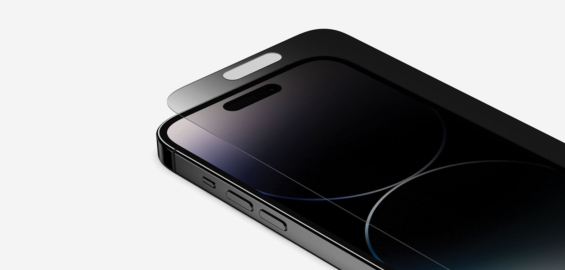 iPhone 14シリーズから搭載されたDynamic Islandを含む全画面を保護できます。また、Dynamic Island部分には透明な素材を使用し、カメラレンズやFaceIDに干渉せずに利用が可能です。