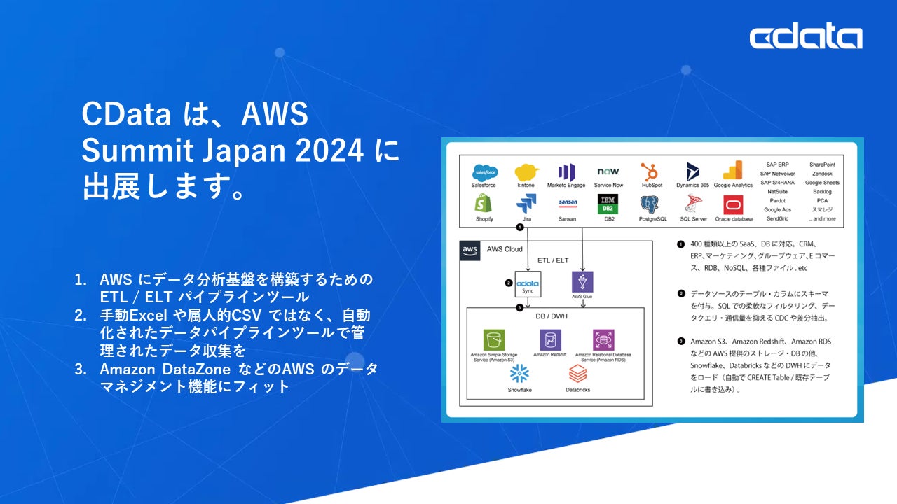 CData Software Japan 合同会社(本社:アメリカノースカロライナ州、日本オフィス:宮城県仙台市、代表社員 職務執行者:疋田 圭介、以下CData)は、6月20日 - 21日に開催される”日本最大のAWS を学ぶイベント”『AWS Summit Japan 2024』にスポンサー出展します。データ分析基盤をAWS に構築する方向けに、属人Excel・CSV に頼らずにあらゆるSaaS・DB データの収集を実現するデータパイプラインツール『CData Sync』を紹介します。