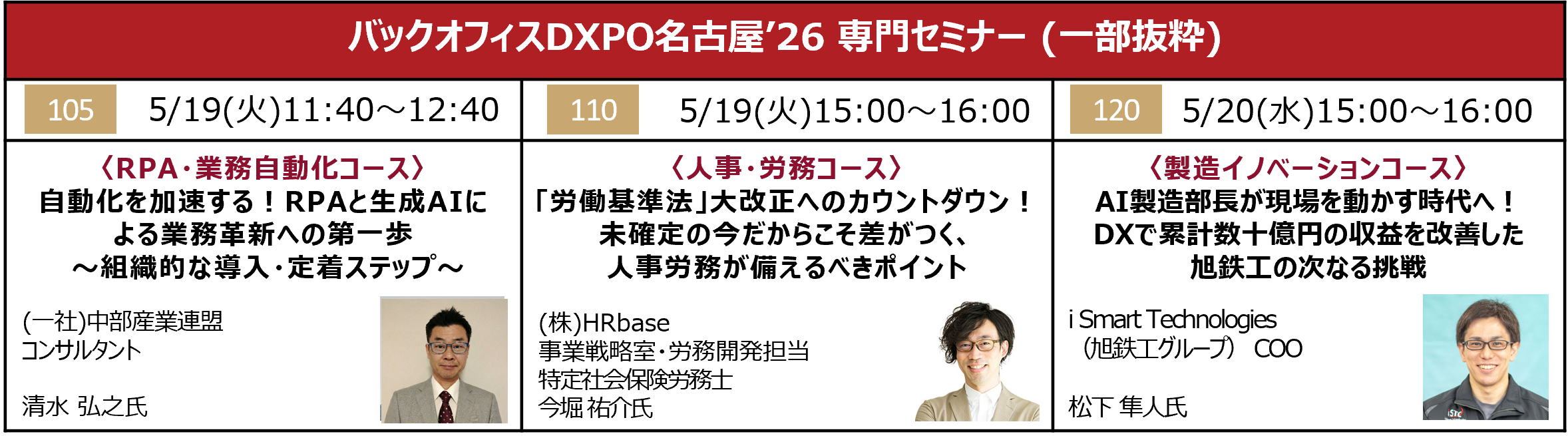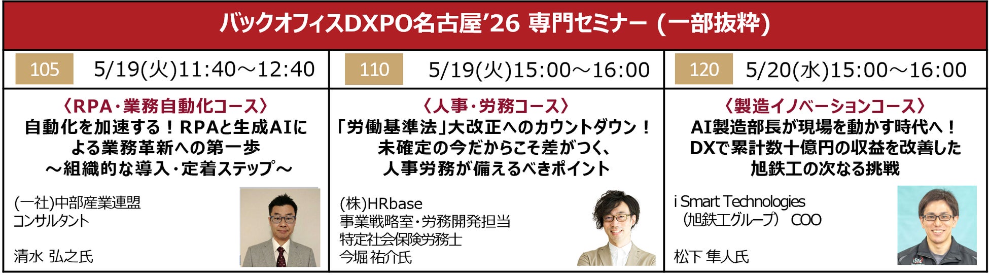 本展では、業界の有識者を講師に迎えた「専門セミナー」も同時開催する。RPA・業務自動化コースでは、(一社)中部産業連盟のコンサルタントとして幅広い業種の企業を支援する清水弘之氏が、RPAと生成AIを組織的に導入し、業務に定着させる秘訣を解説、また人事・労務コースでは、特定社会保険労務士の資格を持つ(株)HRbase 事業戦略室・労務開発担当 今堀祐介氏が、迫る労基法改正に向けて企業が講じるべき対策や盤石な体制のつくり方を紹介するなど、人事・総務・経理のプロはもちろん、DX・業務改革を推進する経営者必聴のセミナーが多数開催される。