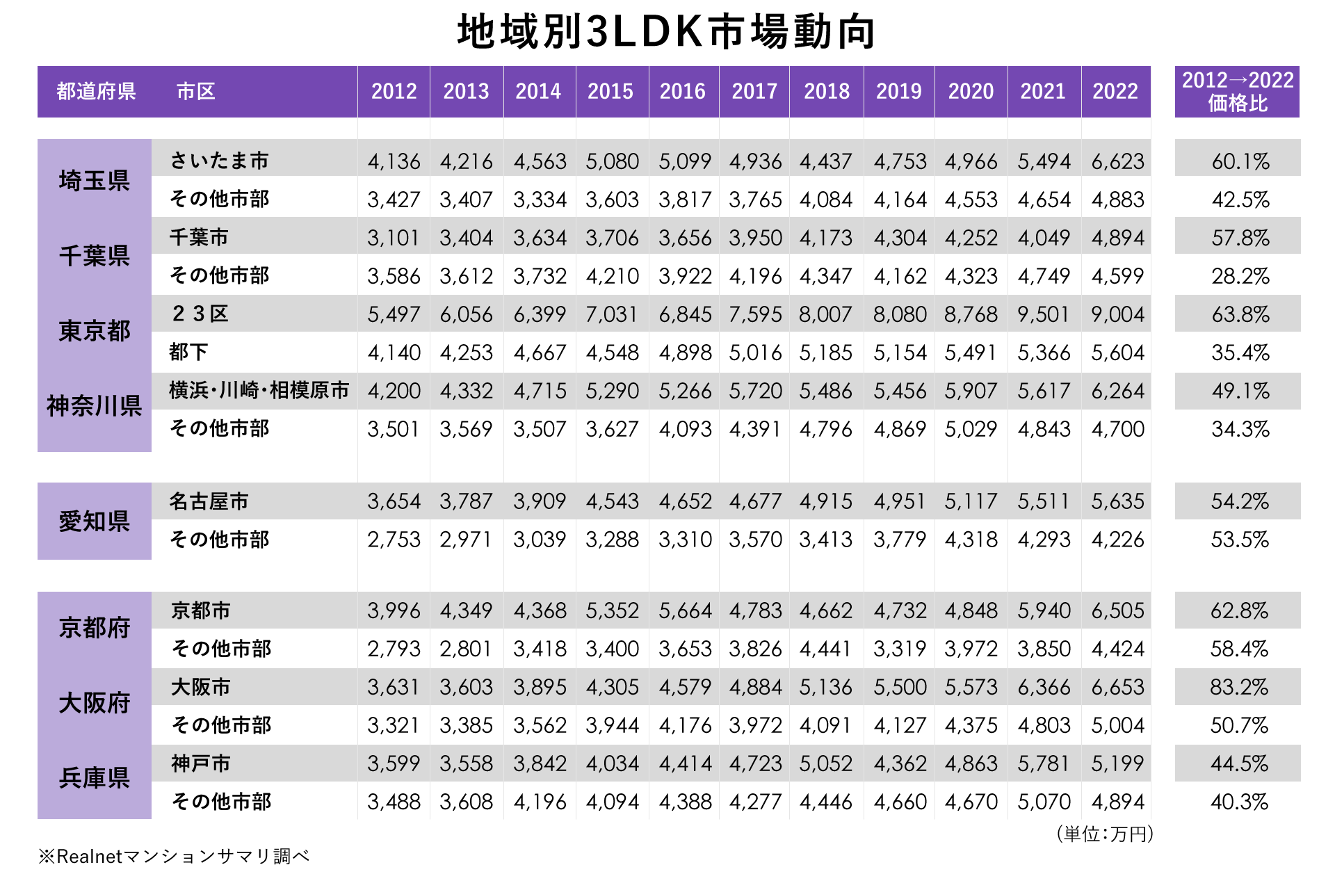 ファミリー向け3LDKマンション市場動向。過去10年で全てのエリアが上昇