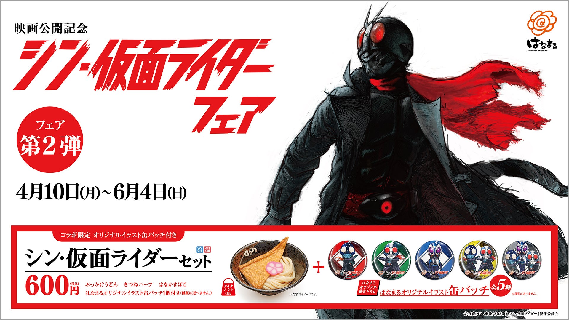 讃岐うどんチェーン「はなまるうどん」を展開する株式会社はなまる(本社:東京都中央区 代表取締役社長:前田良博、以下はなまる)は、2023年4月10日(月)より、全国の「はなまるうどん」「うまげな」「さぬき麺屋」「つるさく」他各店舗(※一部店舗除く)にて、絶賛公開中の映画『シン・仮面ライダー』との第2弾コラボレーションとして、「シン・仮面ライダーフェア第2弾」を開催いたします。
