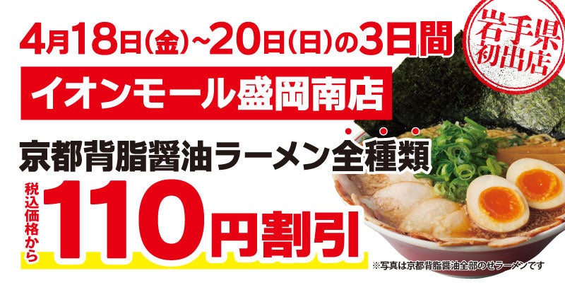 この度オープンを記念して、「イオンモール盛岡南店」にご来店いただいたお客様には、『京都背脂醤油ラーメン全種類』を税込価格から110円割引で販売いたします。