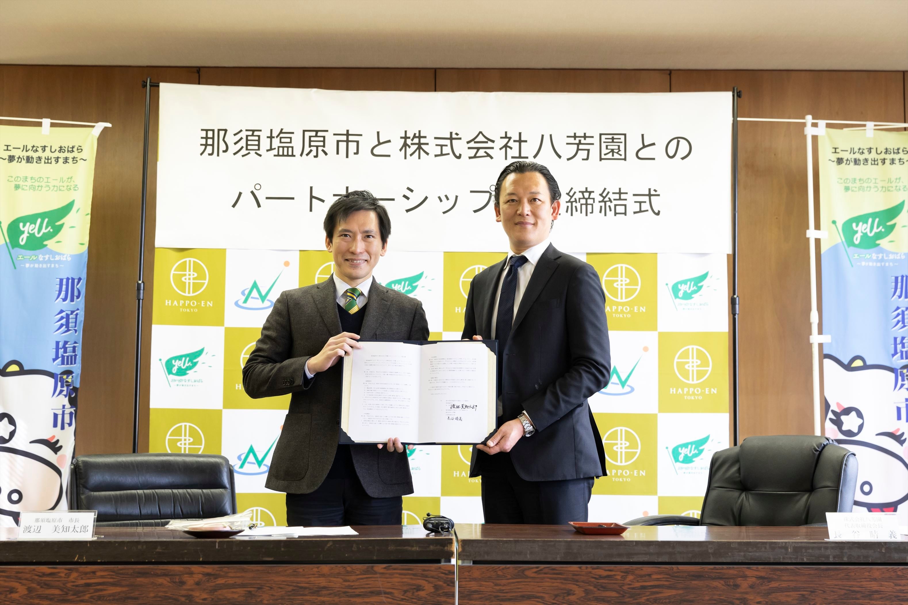 総合プロデュース企業 株式会社八芳園(取締役社長:井上義則、東京都港区白金台1‐1‐1、以下「八芳園」)は、栃木県那須塩原市との「パートナーシップ協定」を締結し、2022年1月28日(金)、那須塩原市にて締結式を執り行いました。八芳園のノウハウを活かし、那須塩原市の農畜産物の販路拡大やイベントの促進等による地域の魅力発信・地域活性化の推進、次世代への人材育成に取り組んでまいります。