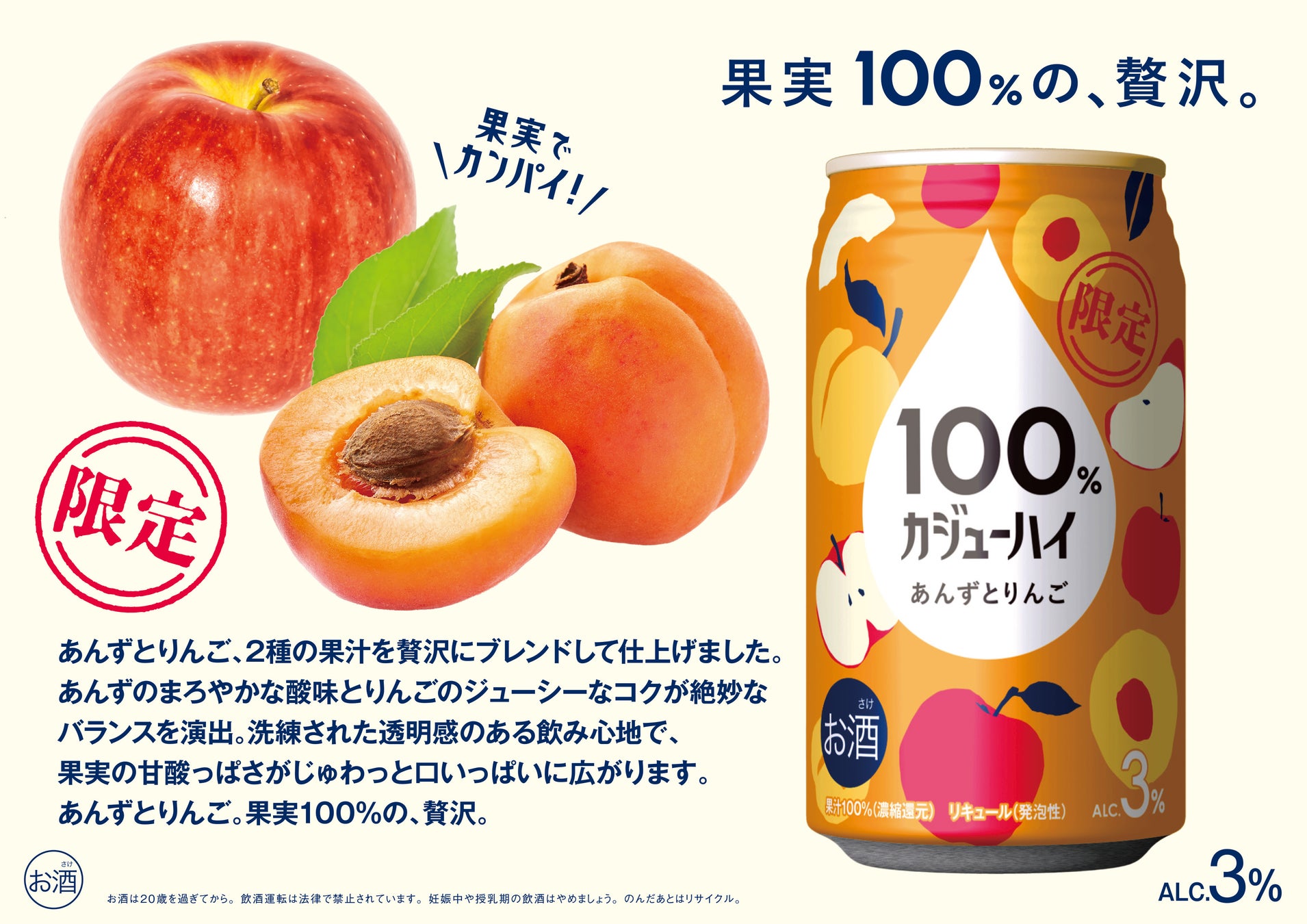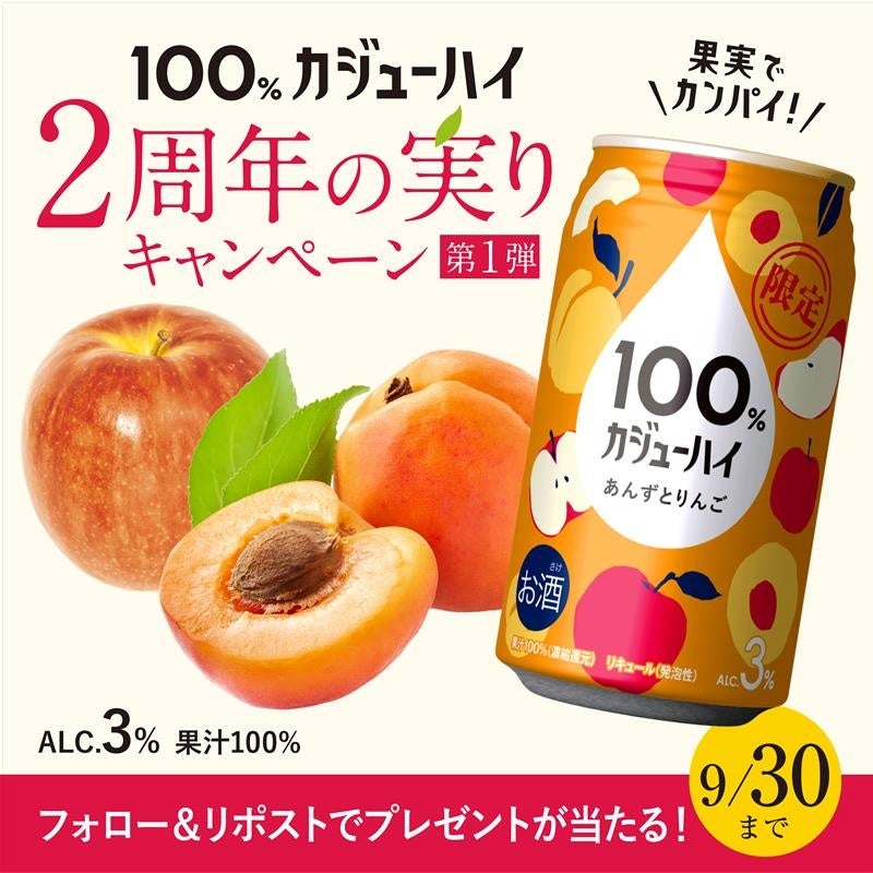 新商品「あんずとりんご」で祝う、2周年にカンパイ!『果実100%の、贅沢。』100%カジューハイ 2周年SNSキャンペーン第1弾がスタート