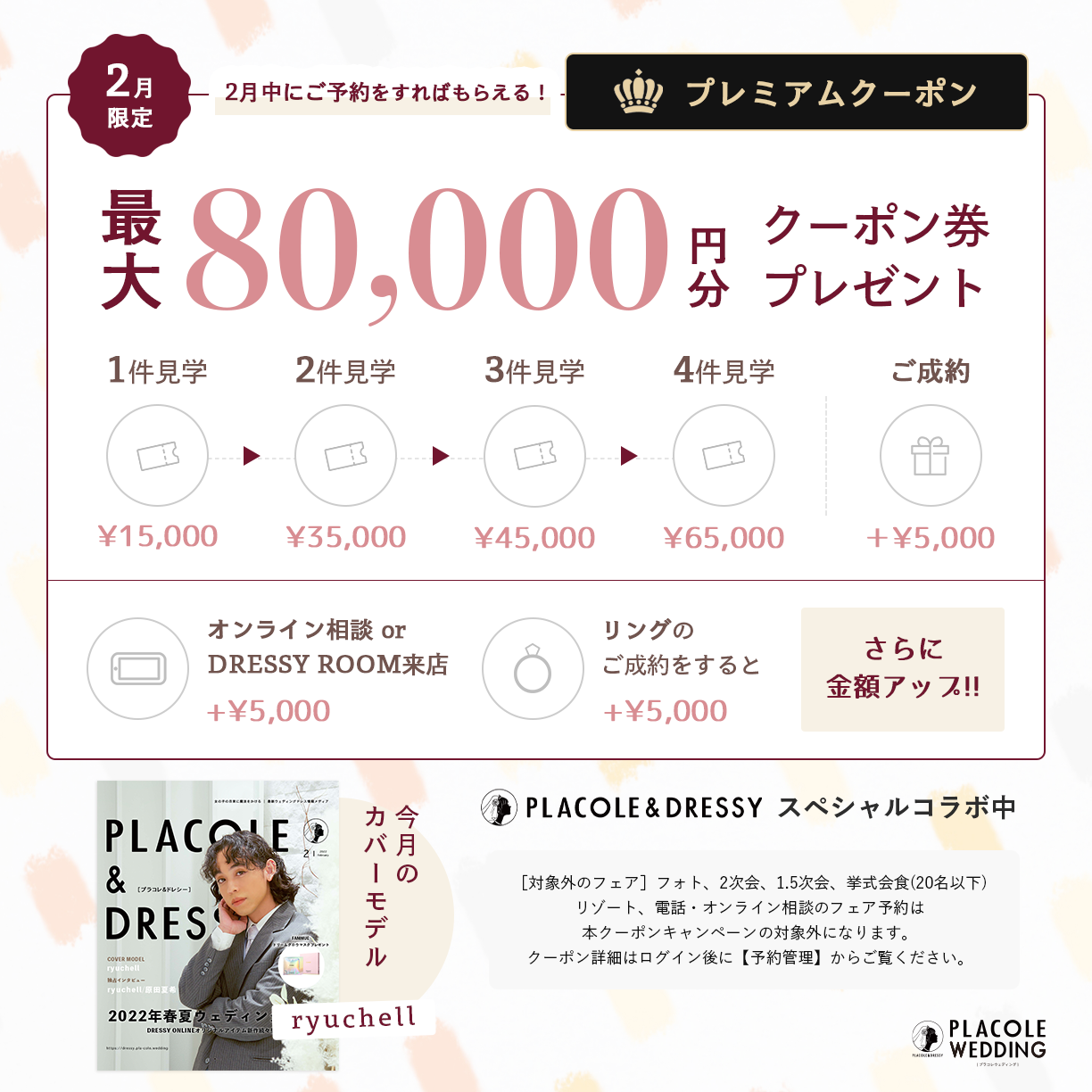 DRESSY ROOM来店後、プラコレウェディングで提携している1100以上の結婚式場のブライダルフェアの予約・成約をするともらえる最大8万円のクーポンも。賢くオトクに結婚式場探しをしませんか?