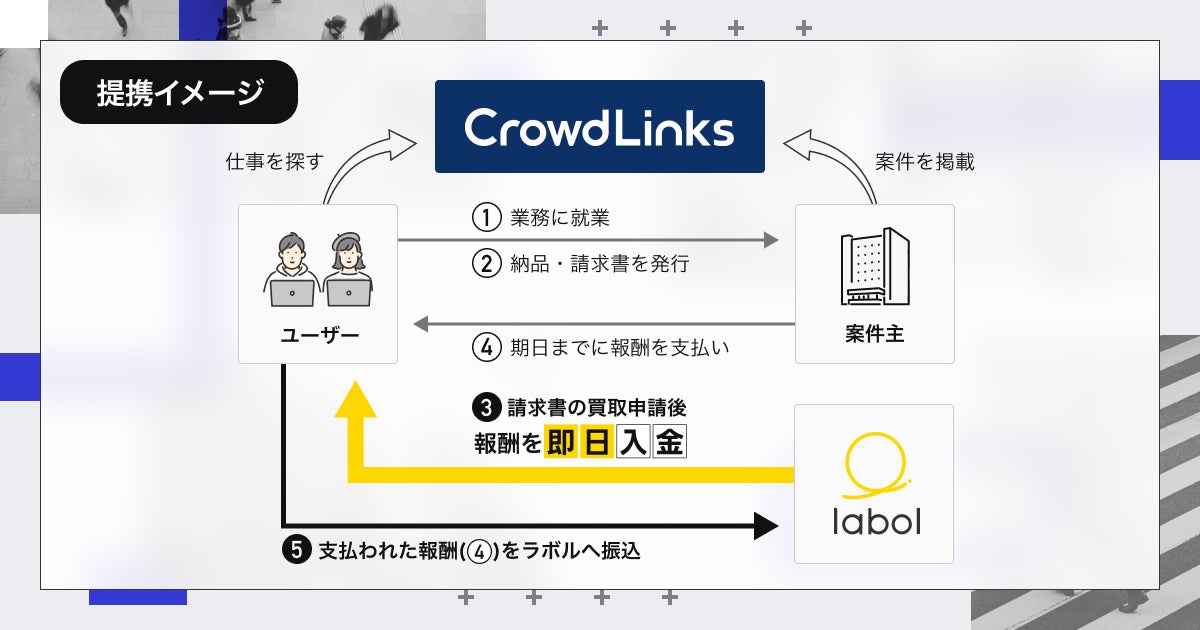今回のサービス連携により、「クラウドリンクス」を利用する副業・フリーランス人材は、「labol(ラボル)」を特別条件で利用することが可能となります。一方、「labol(ラボル)」の利用者もまた「クラウドリンクス」のサービスを利用することで、事業活動の拡大が期待できます。