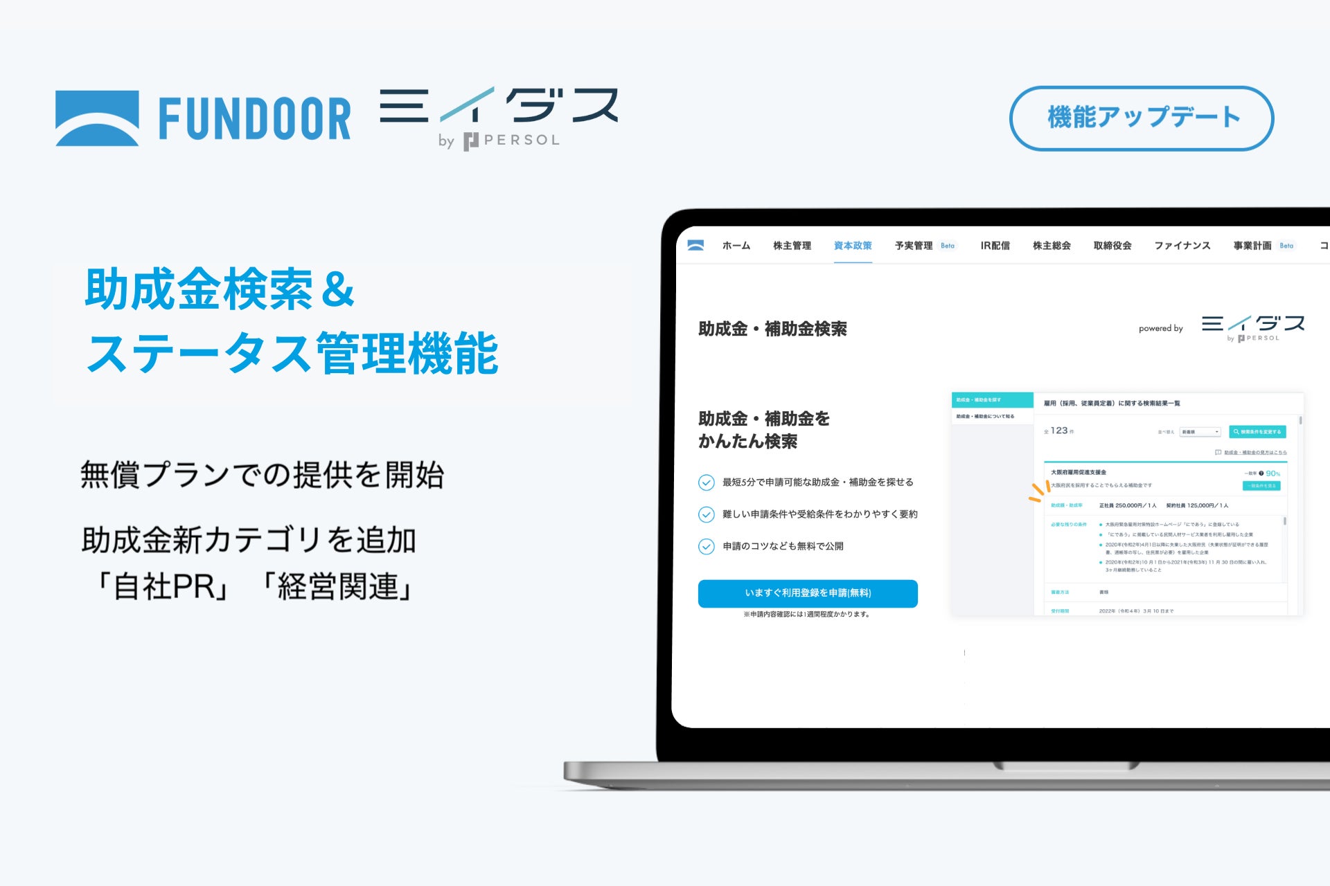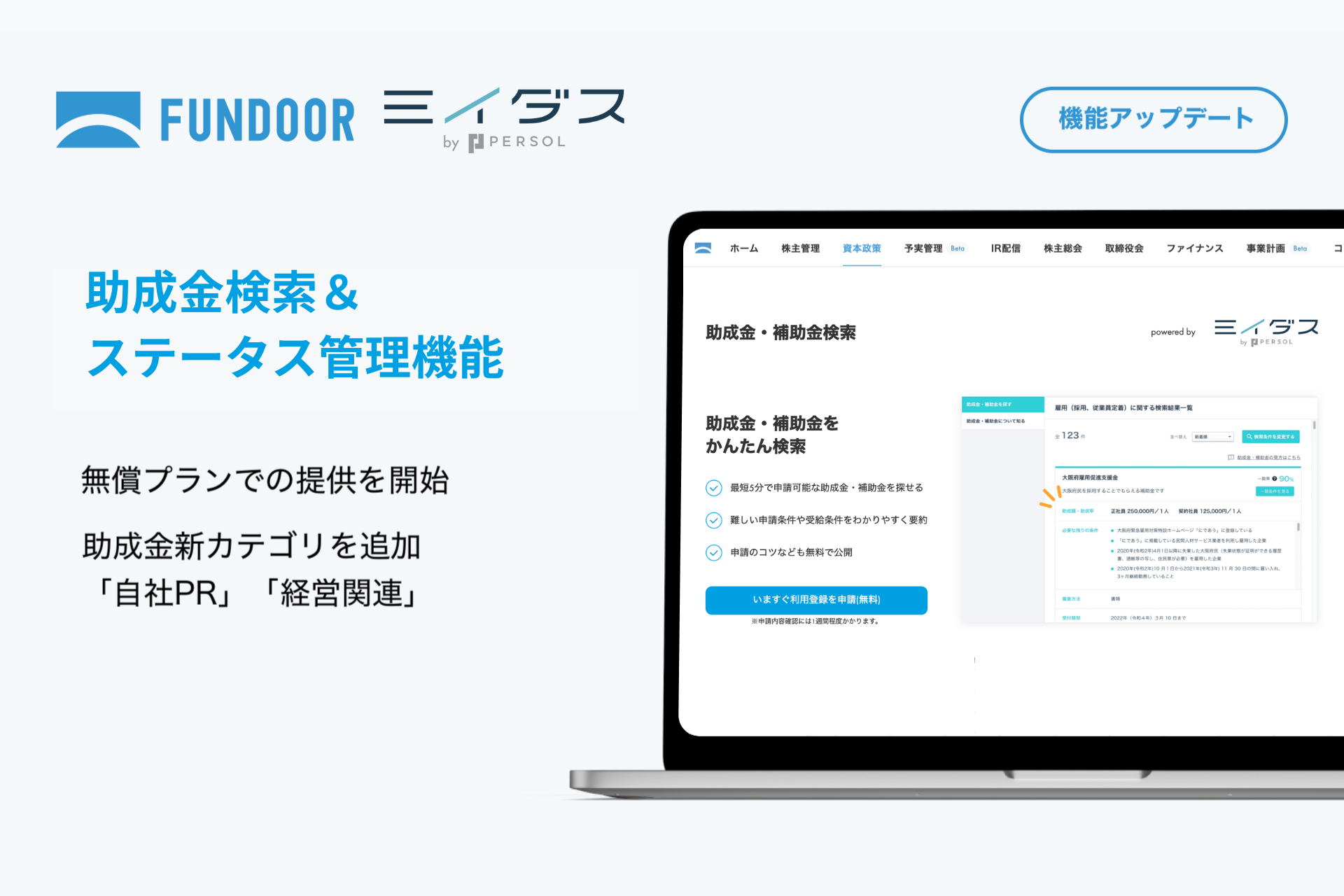 株主管理・経営管理プラットフォーム「FUNDOOR」、ミイダス株式会社との連携サービス「助成金検索&ステータス管理機能」をアップデート