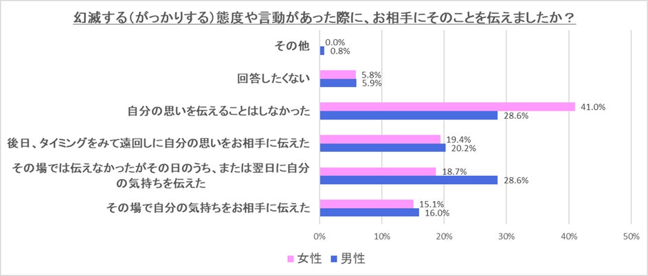 続いて、お相手の態度や言動に幻滅(がっかり)した場合に、「お相手にそのことを伝えたかどうか」という質問に対しては、男性と女性で回答内容に大きな違いがみられました。