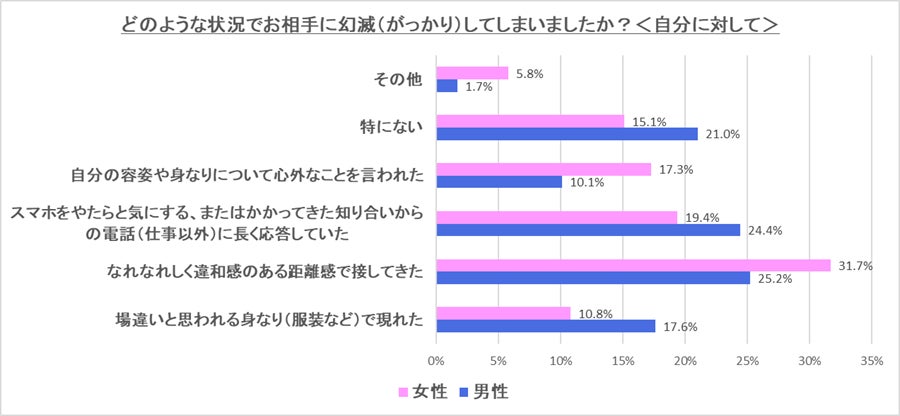 この設問ではお相手から直接ご自身に対する態度や言動で幻滅(がっかり)したシーンに限定して質問を行いました。男女ともに1番多かった回答は「なれなれしく違和感のある距離感で接してきた」という回答となりました。特に女性の回答が31.7%と、男性25.2% を約6ポイントも上回る回答結果となり、男女共通の認識とはいうものの、女性の方が男性よりその意識が高いことが読み取れる結果となりました。また、「スマホを気にする態度」については、男性から女性に対して幻滅(がっかり)する傾向が高いという結果となり、男性の回答の中で最も「なれなれしく違和感のある距離感で接する」の25.2%とほぼ同割合となる24.4%という回答結果となりました。また、「場違いな身なり(服装)で現れた」という回答は、女性より男性の方がお相手に幻滅(がっかり)するという回答が7ポイント高かったということは興味深い結果といえるかもしれません。