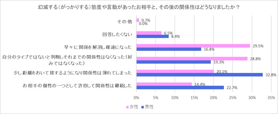この設問では「幻滅(がっかり)した経験のあるお相手と、その後の関係性がどうなったか」について質問をしましたが、回答結果において男女間で大きな違いがみられました。