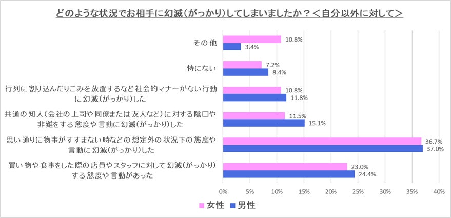 まず、幻滅(がっかり)したシーンとして、自分以外の第三者や周囲の人に対するお相手の態度、言動を想定したシーンの中から選択する質問を行った結果、男女ともほぼ同じ回答結果となりました。最も回答割合が多かったのは、「思い通りに物事がすすまない時などの想定外の状況下の態度や言動に幻滅(がっかり)した」という選択肢となりました。やはり異性のお人柄や性格がとっさに出てしまう状況下で、ふと垣間見た態度や言動から、お相手に対するイメージが一瞬にして崩れてしまうというネガティブなインパクトが、幻滅(がっかり)という強い印象を与えてしまうという事が男女共通の認識であることがうかがえます。