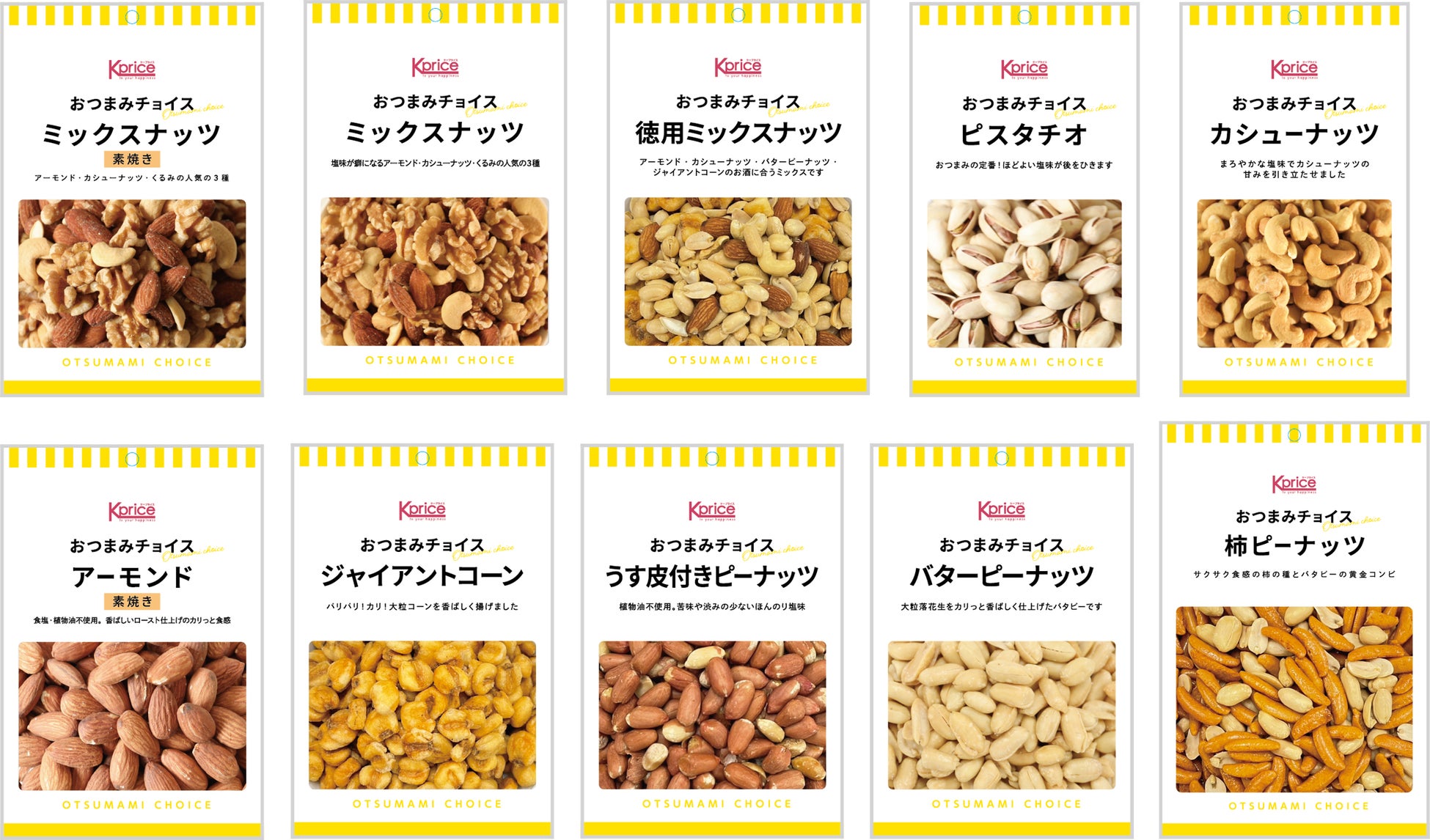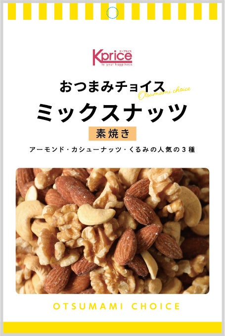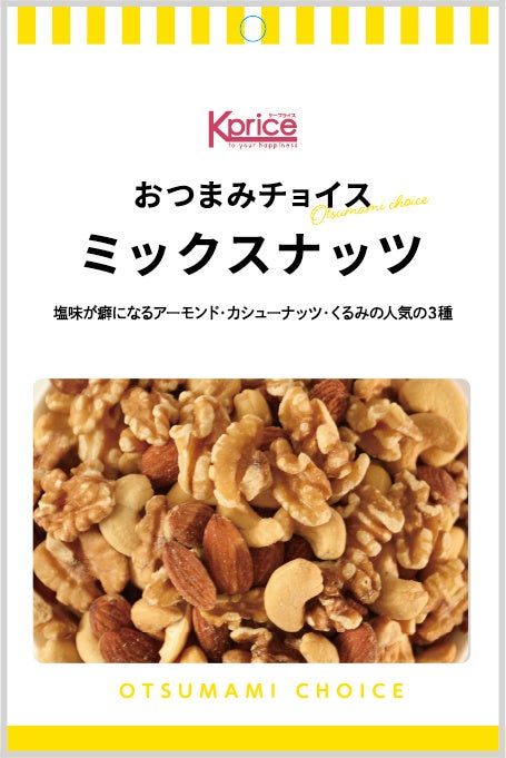 当社のプライベートブランド「Kprice」は、低単価で高品質な商品を目指し、飲料を中心に展開してきました。今回は、先月発表しました「PREMIUM PROOST(プレミアムプロースト)」、「810(ハチイチマル)」の発売に続き、プライベートブランド初の食品ラインナップとして、ビールやハイボールなどのお酒と相性がよく、そのまま食べても癖になるナッツやピーナッツなどの商品”おつまみチョイス”シリーズを新たに開発しました。