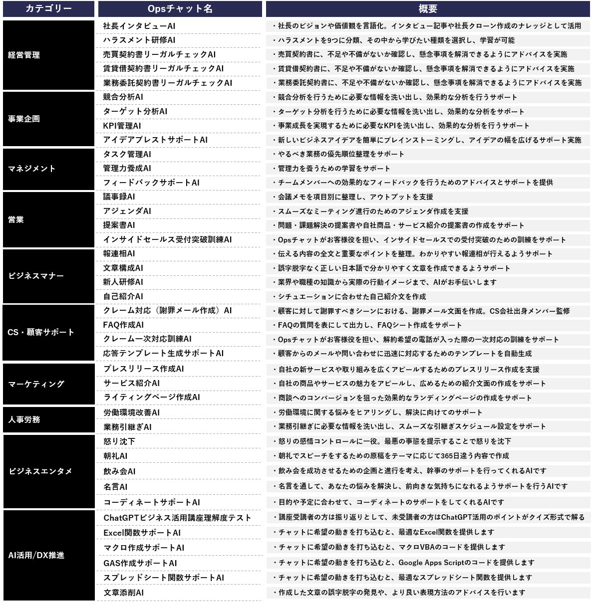 今回リリースした3つ以外にも、既に法人向けChatGPT「Ops(オプス)AI」には当社独自開発のGPTsが搭載されています。