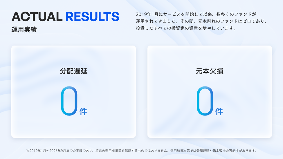 当社では、これまで上場企業を中心とした113社が組成する551のファンドを募集し、分配遅延・貸し倒れは0件です。厳しい審査を通過した上場企業を中心としたファンドの組成に注力しています。その結果、サービス開始以来、現在に至るまで全てのファンドで分配遅延・元本欠損は発生しておりません。