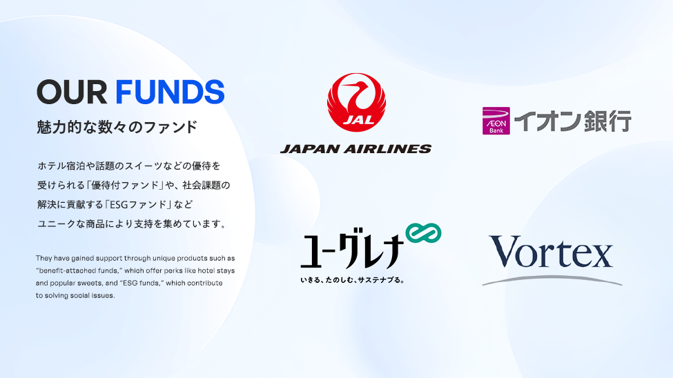また、ホテル宿泊や話題のスイーツ・定期預金の特別金利などの優待を受けられる「優待付ファンド」や、社会課題の解決に貢献する「ESGファンド」など、ユニークな商品の提供により、多くの支持を集めています。