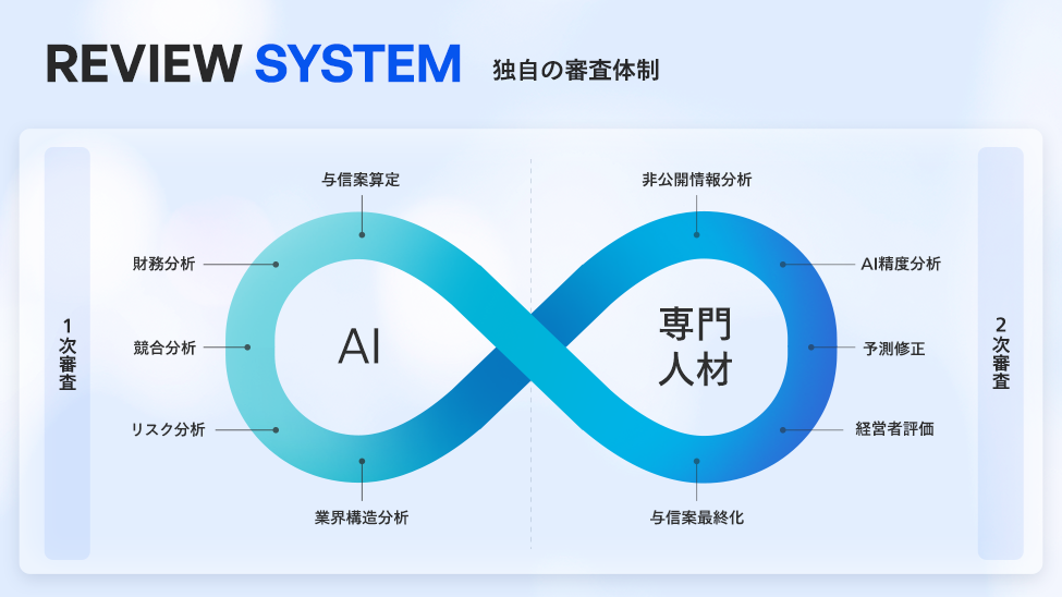 財務資料や、独自のリスク算定によるスクリーニングをAIで実施し、AI審査を通過した企業をさらに専門人材が揃うチームで分析していきます。上場企業であっても審査を通過するのは全体の約58%です。