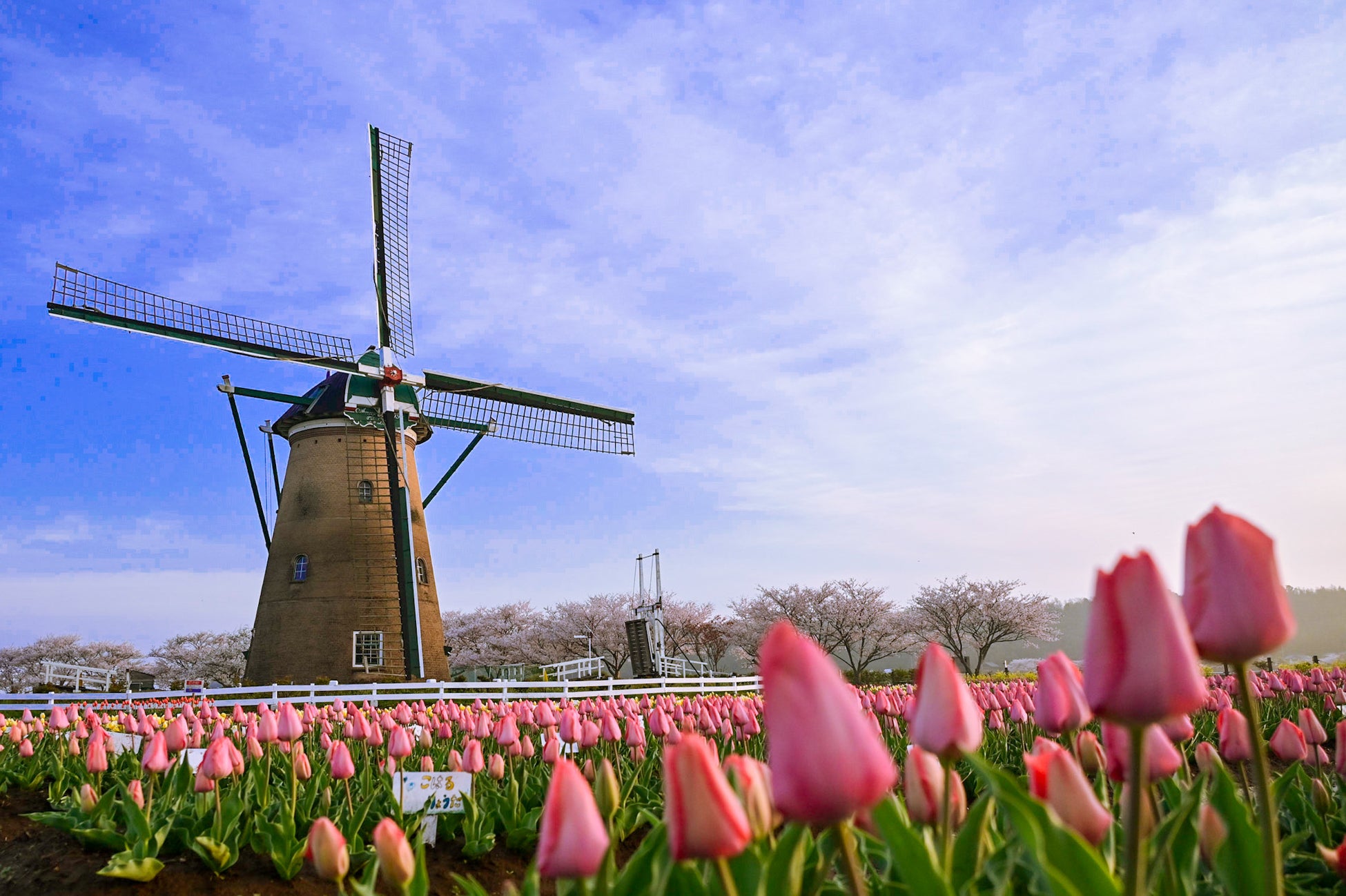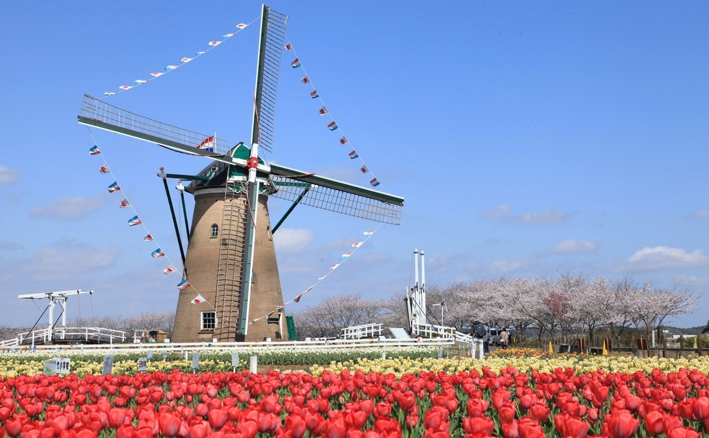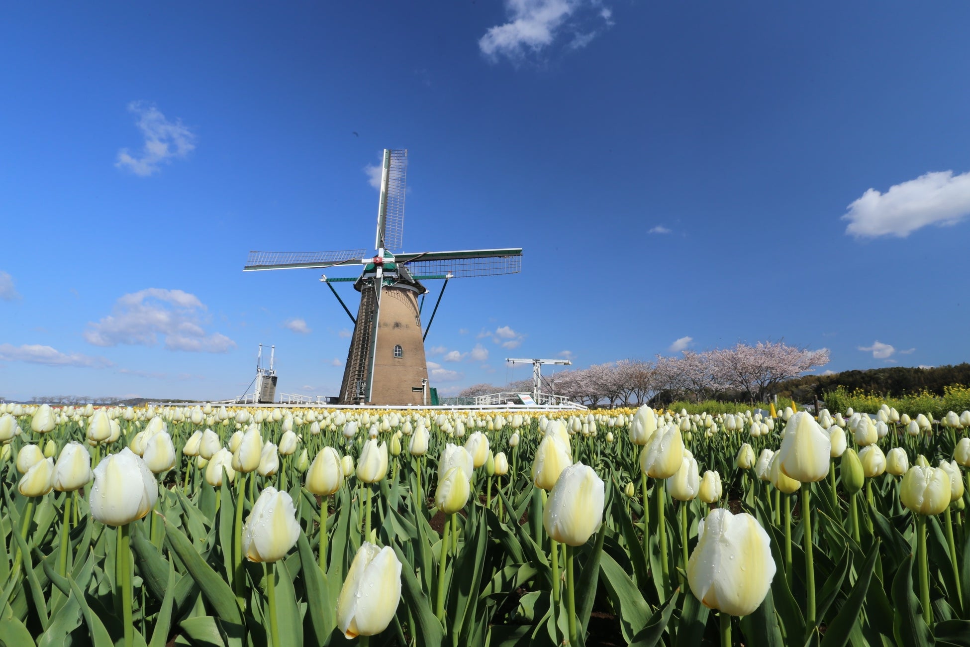 風車を背景に関東最大級となる65万本のチューリップがお出迎え!