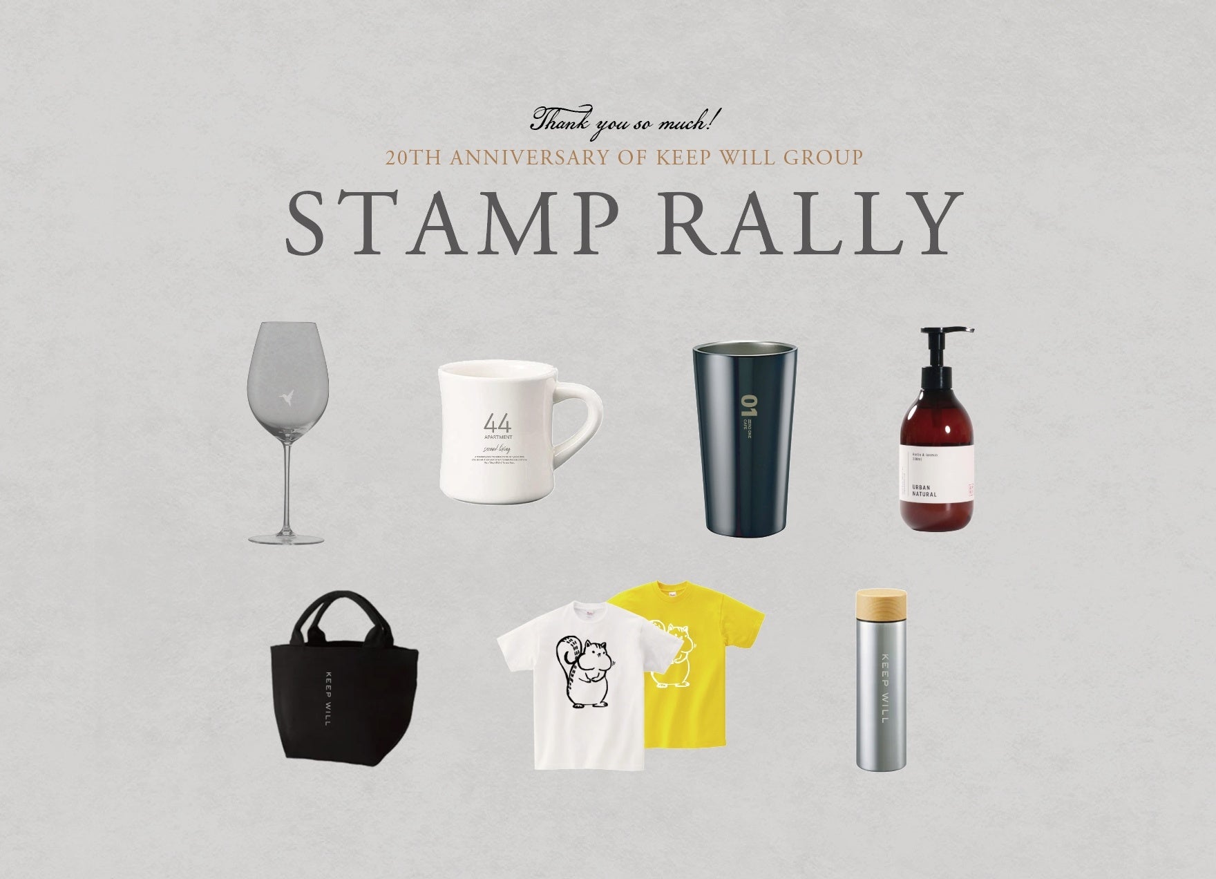 【キープウィルグループ20周年記念オリジナルグッズをプレゼント】マグカップにワイングラス、タンブラーなど店舗を周るともらえるスタンプラリーを開催