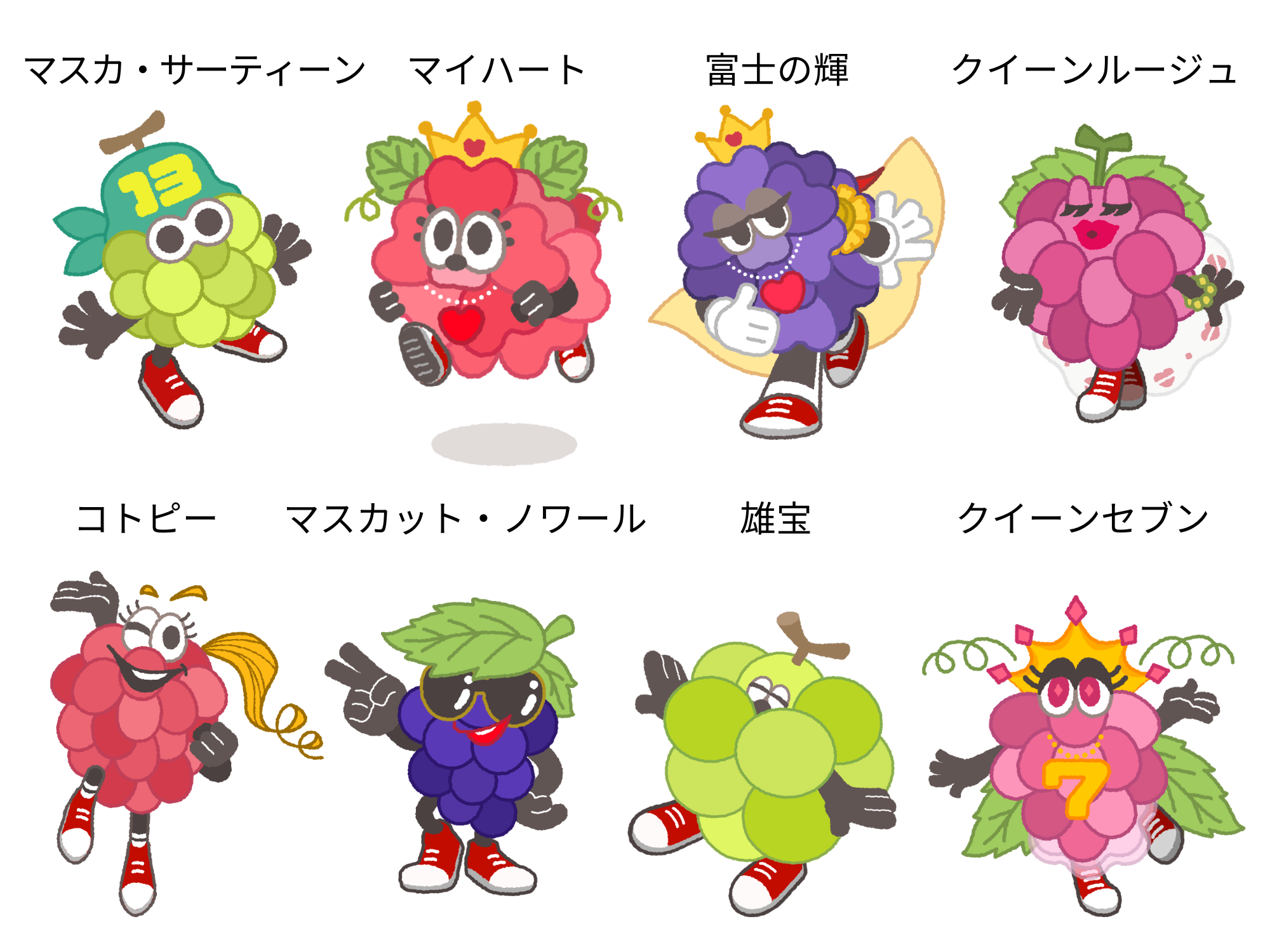 シャインマスカットを親に持つ8品種のぶどうをキャラクター化し、それぞれの魅力やシャインマスカットとの違いをアピールします。お客様はお気に入りの品種に投票していただくことで、次世代の王者となるぶどうを決定します。