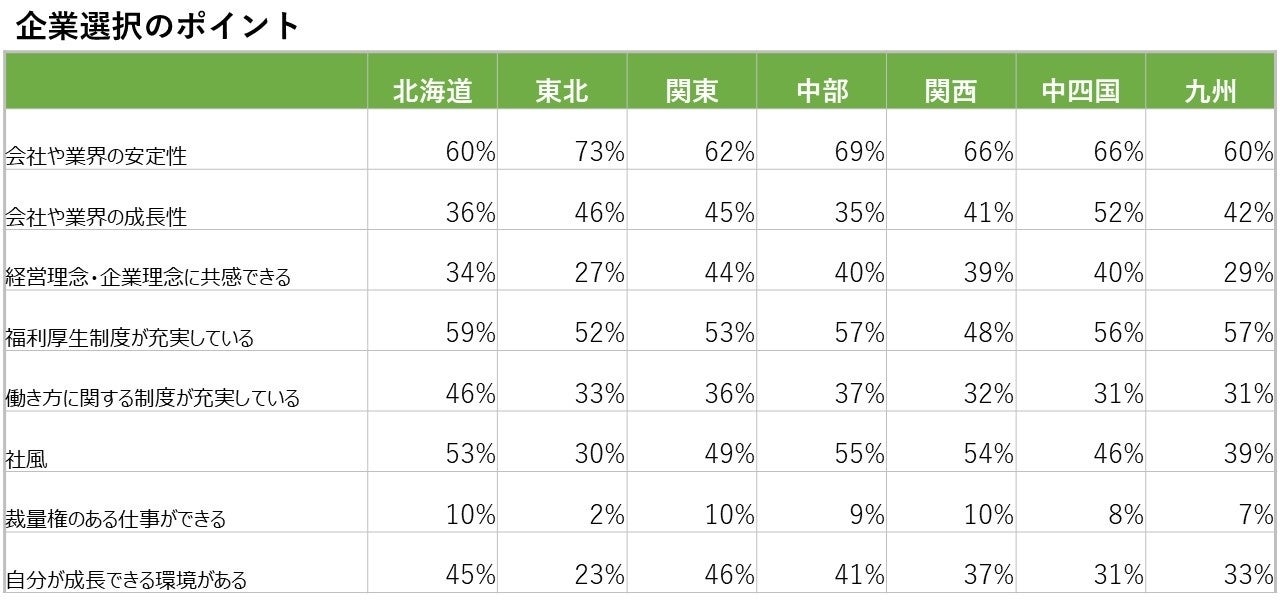 「志望する業種」に対する質問では、全エリア共通でメーカー・サービス・商社がトップ3となった。また、「企業選択のポイント」に対する質問では、全エリア共通で「会社や業界の安定性」がトップとなった。学生の志向として「会社や業界の安定性」がキーワードとなっていることが読み取れる。