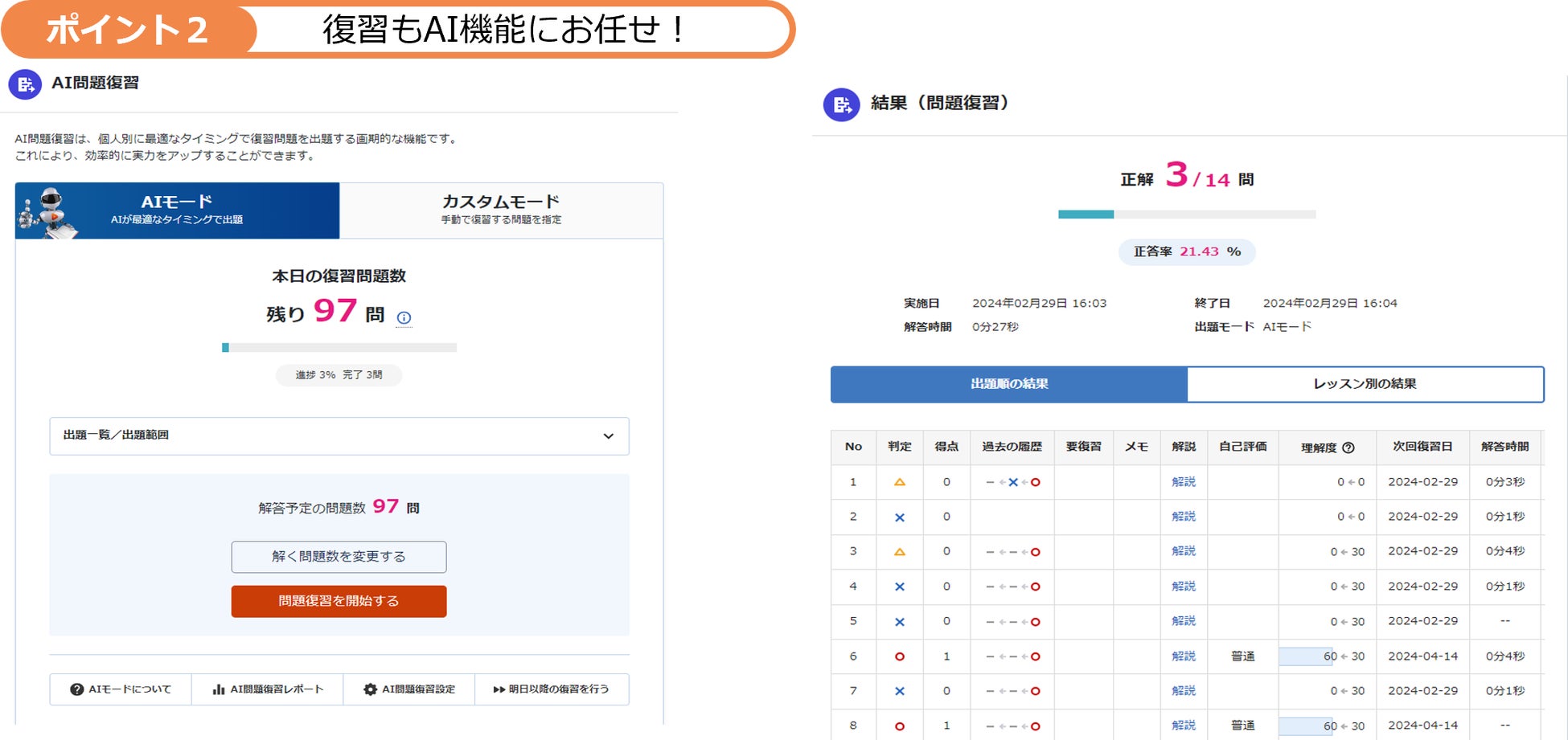 2)復習もAI機能にお任せで効率的に。AI問題復習機能で忘れてしまう前に解ける!