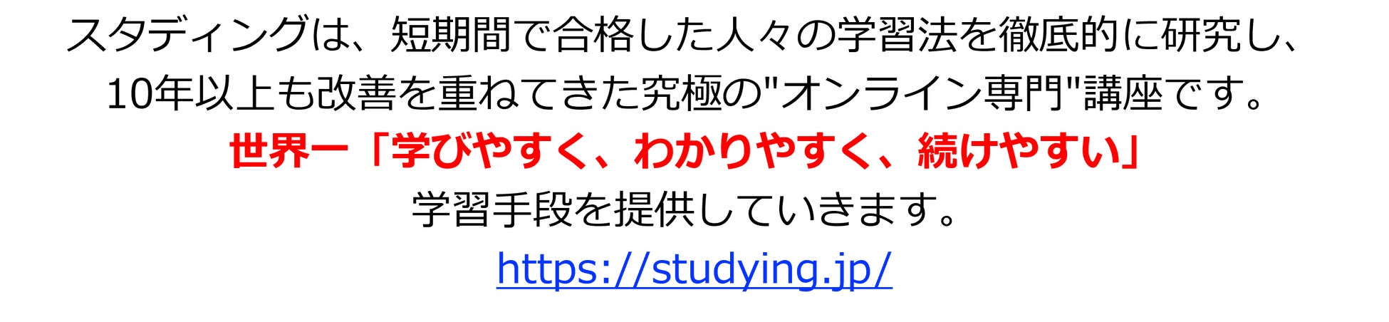 「スタディング」( https://studying.jp/ )は、短期間で合格した人々の学習法を徹底的に研究し、10年以上も改善を重ねてきた究極のオンライン資格取得講座です。