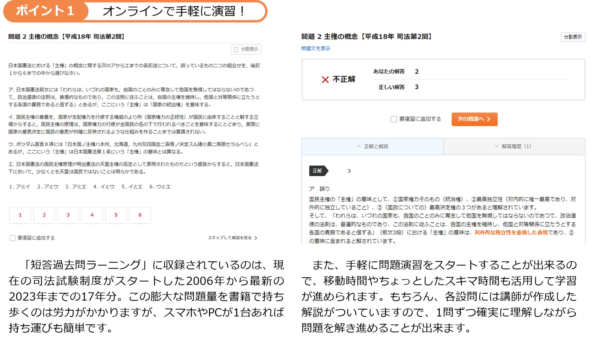 1)オンラインでいつでもどこでも何度でも解ける。だから、スキマ時間で繰り返し演習が出来る!
