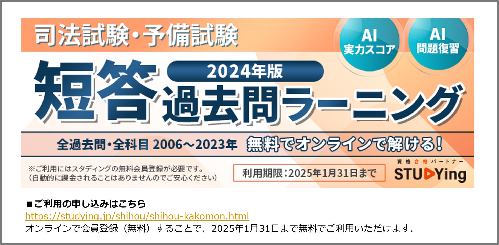 司法試験及び予備試験受験生が短答式試験の過去問演習に学習時間の多くを割くようになる4月に合わせて、この「短答過去問ラーニング」をリリースしました。「短答過去問ラーニング」はオンラインにてPCやスマートフォンで短答過去問をいつでもどこでも好きなタイミングで解くことができ、自動採点や解答履歴、成績統計の機能を利用できます。さらに、スタディングの有料講座と同様にAI機能も無料で提供されます。