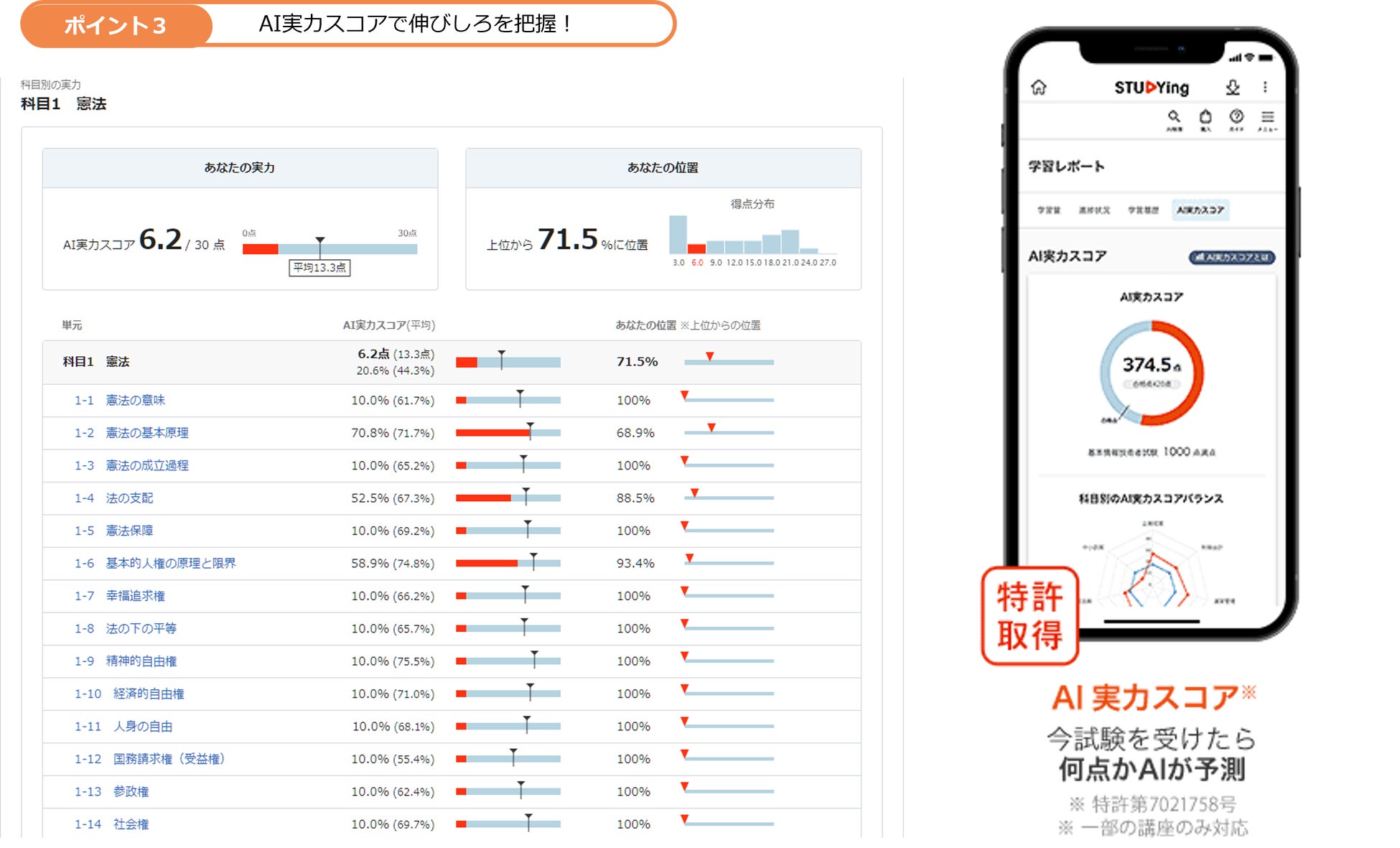 3)AI実力スコアで実力診断。自分の現在地がわかる!