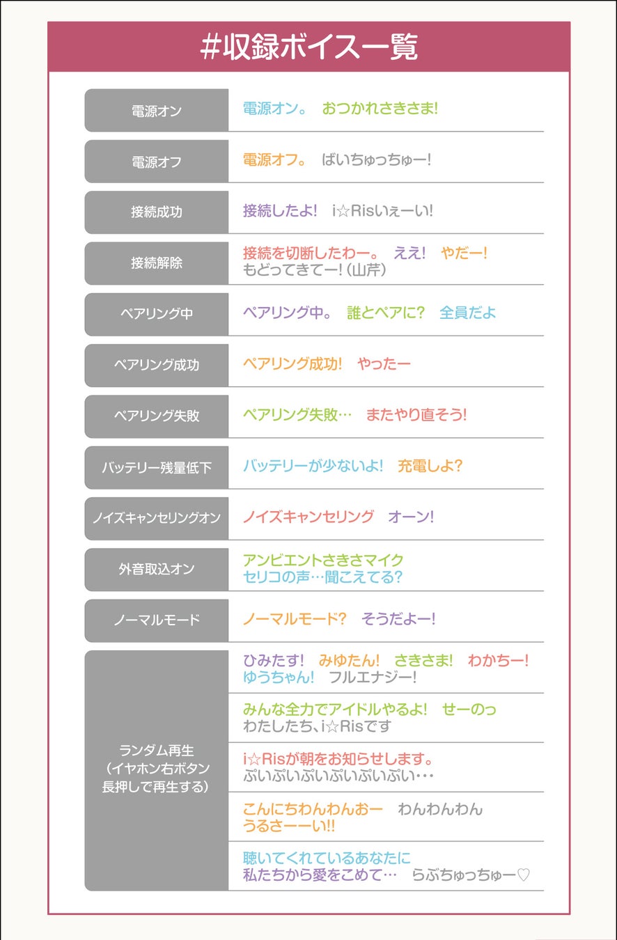 ボイスのモードは各メンバーの「ソロモード」、メンバー同士の掛け合いが楽しめる「カップリングモード」、i☆Ris全員で操作をアシストしてくれる「i☆Risモード」の合計16モードを搭載。収録ボイスは450種以上。全てイヤホンのための完全新録です。