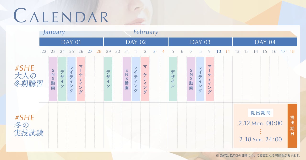 具体的な実践の場として「SHE大人の冬期講習」と「SHE冬の実技試験」の2つのプログラムを提供し、Webデザイン、ライティング、SNSマーケティング、SNS動画制作の4コースで開催します。