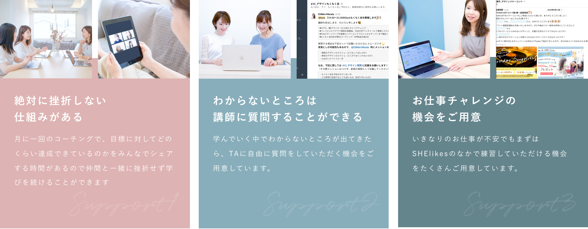 パソコンやスマートフォンなどオンラインで視聴できるコース動画、コーチングやティーチング、同じ目標や趣味嗜好で集まれるコミュニティをはじめとした学び続けられる手厚いサポート、SHElikes内で挑戦できるお仕事案件など、学びをすぐに仕事として生かすことができるのが特徴です。