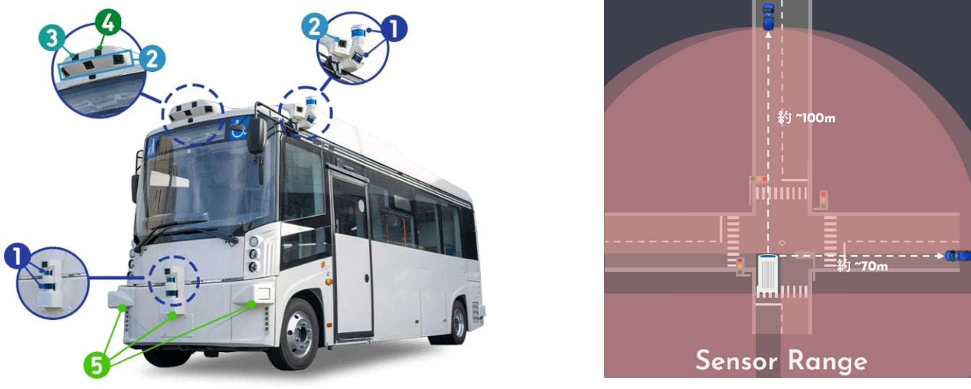 <車両スペック> 車両:ティアフォー製Minibus 乗車定員:15名 (実証では試乗者10名+運行関係者で運行) サイズ:全長7.19m/全幅2.32m/全高3.05m 車両重量:1,350kg 自動走行時最高速度:35㎞/h |