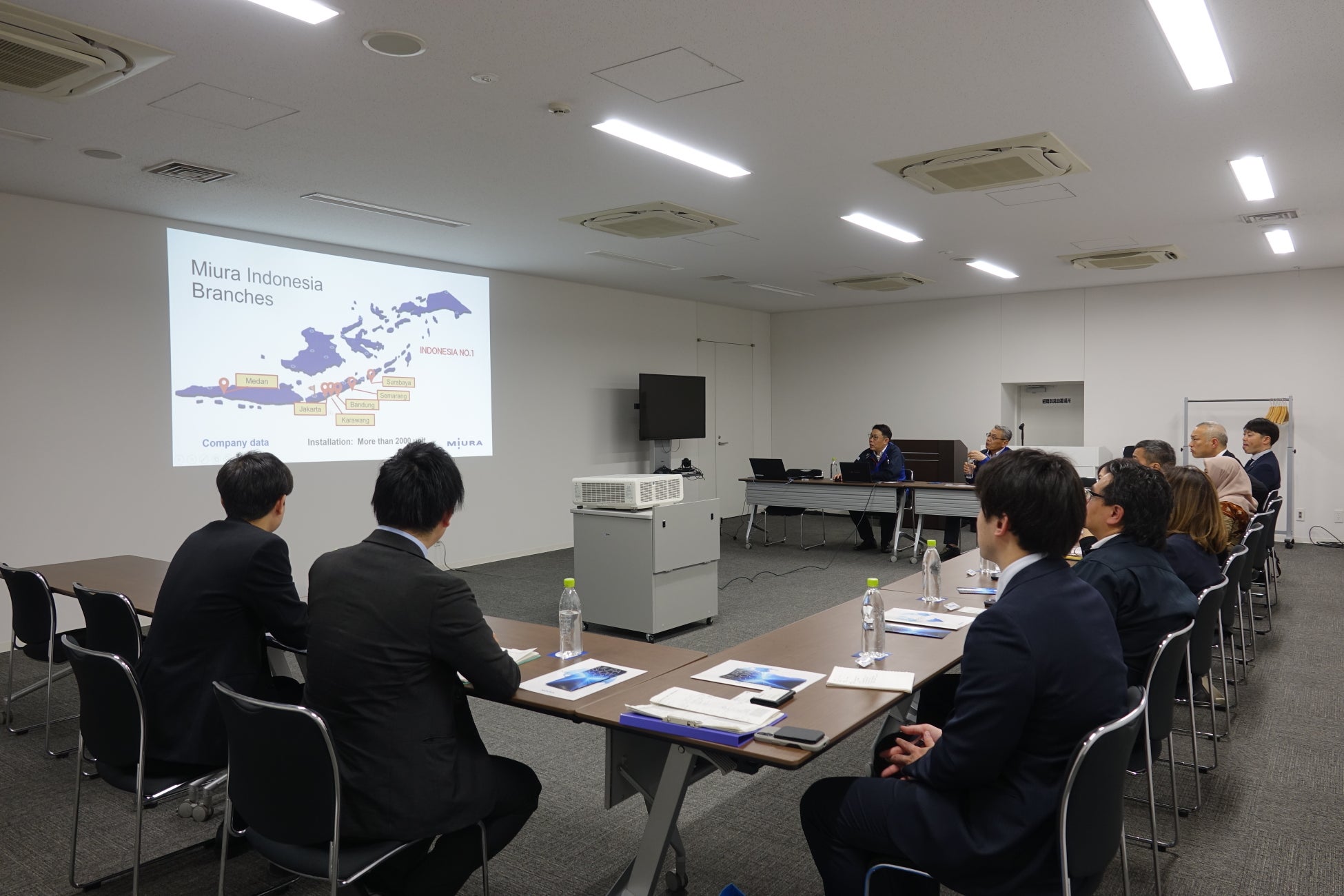 インドネシア商工会議所御一行様は、三浦工業 特別顧問 兒島好宏による挨拶の後、担当者による会社概要の説明を受け、その後、ショールームを見学しました。今回の企業視察を通じて、愛媛県とインドネシアの両地域の有益な関係構築に三浦工業も貢献してまいります。