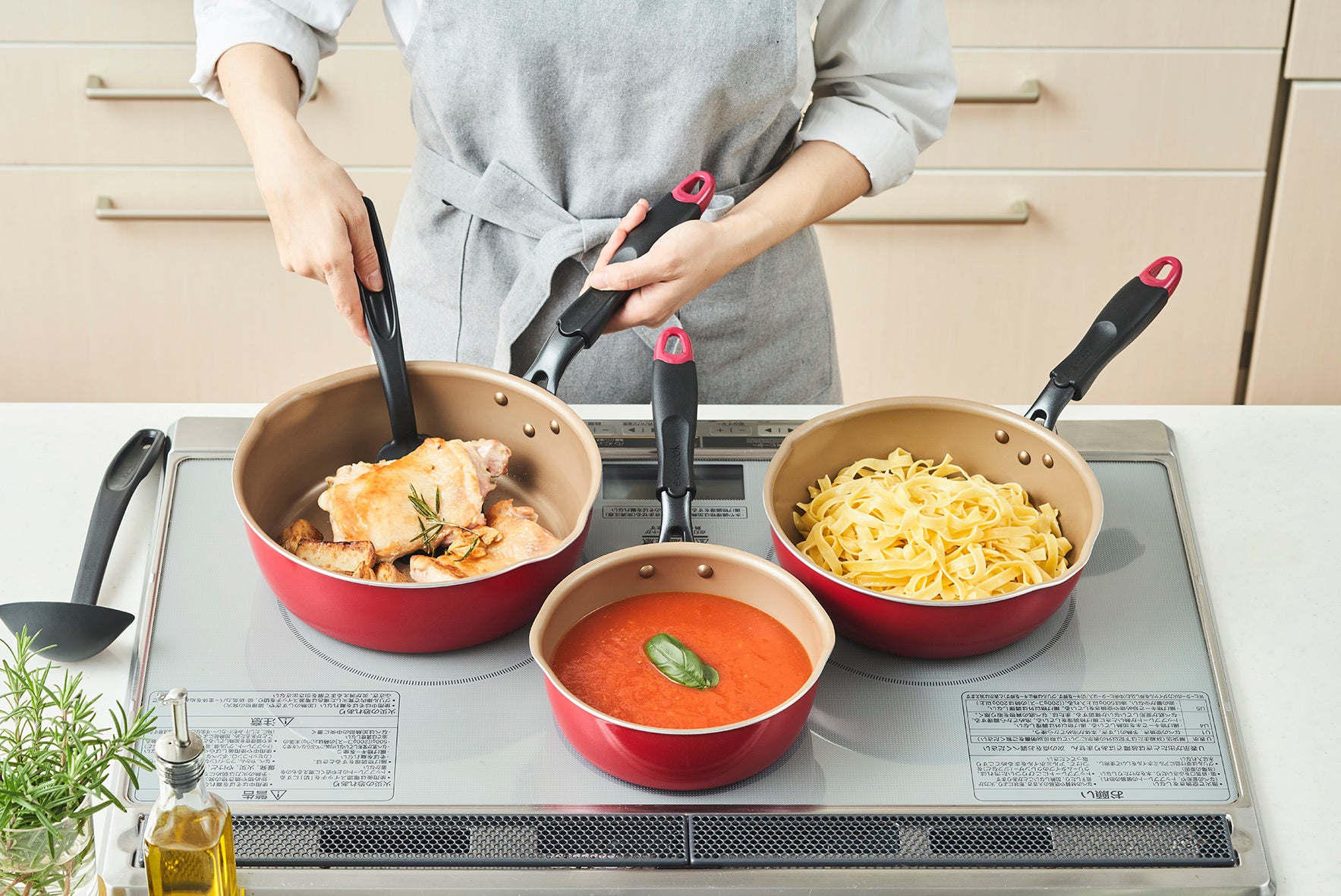 マルチパンは、フライパンのように焼き面積が広く、鍋のように深さのある構造となっています。鍋のように汁物を料理するだけでなく、フライパンの構造を研究し、縁の角度に丸みを持たせることで、炒飯や野菜炒めなどの炒め料理もできるように工夫しています。これ1台で和洋中、様々な料理を作ることができます。