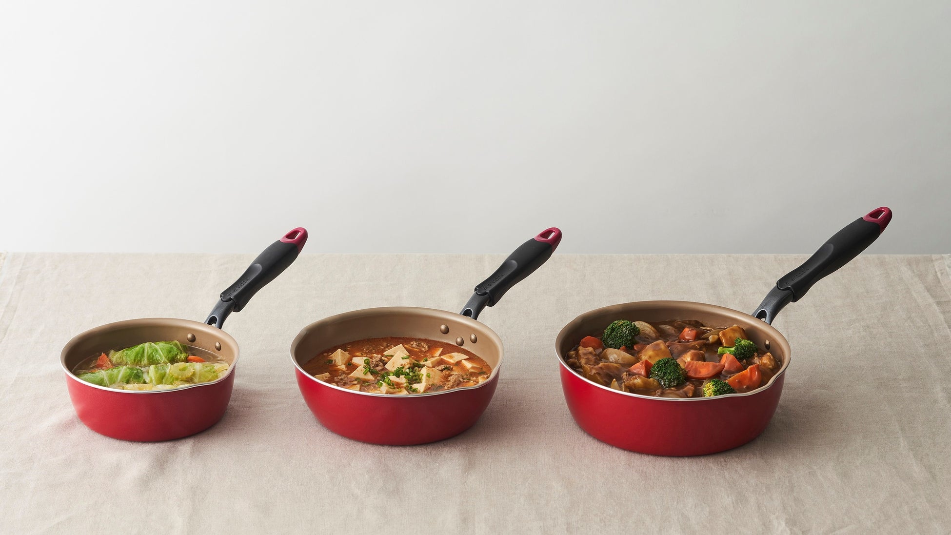 マルチパンは3つのサイズ展開となっています。3サイズとも深さがあるので、油や調理物が飛び跳ねにくく、キッチン周りを清潔に保つことが出来ます。