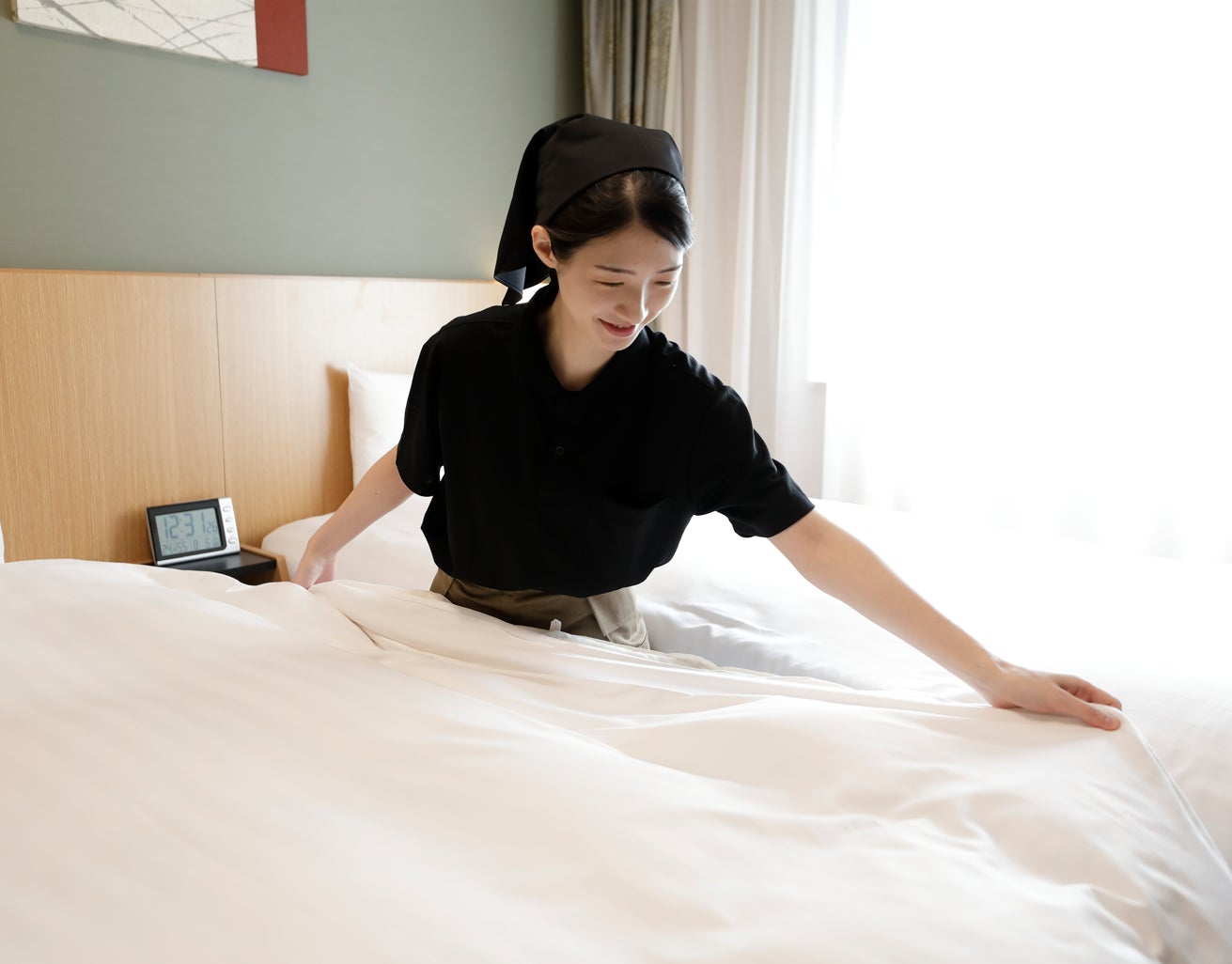 ドーミーインでは、2019年より中・高校生を対象にホテル業界の職業観を育むための講演会や、フロント受付対応、客室チェックなどの職業体験を通じた“学びの場”の提供である「DOMINISTA CHALLENGE」を実施しています。職業体験プログラム内では、各部署の業務内容や役割、お客様に快適にお過ごしいただくための工夫等について学び、ホテルで働く楽しさや醍醐味を体験いただきます。