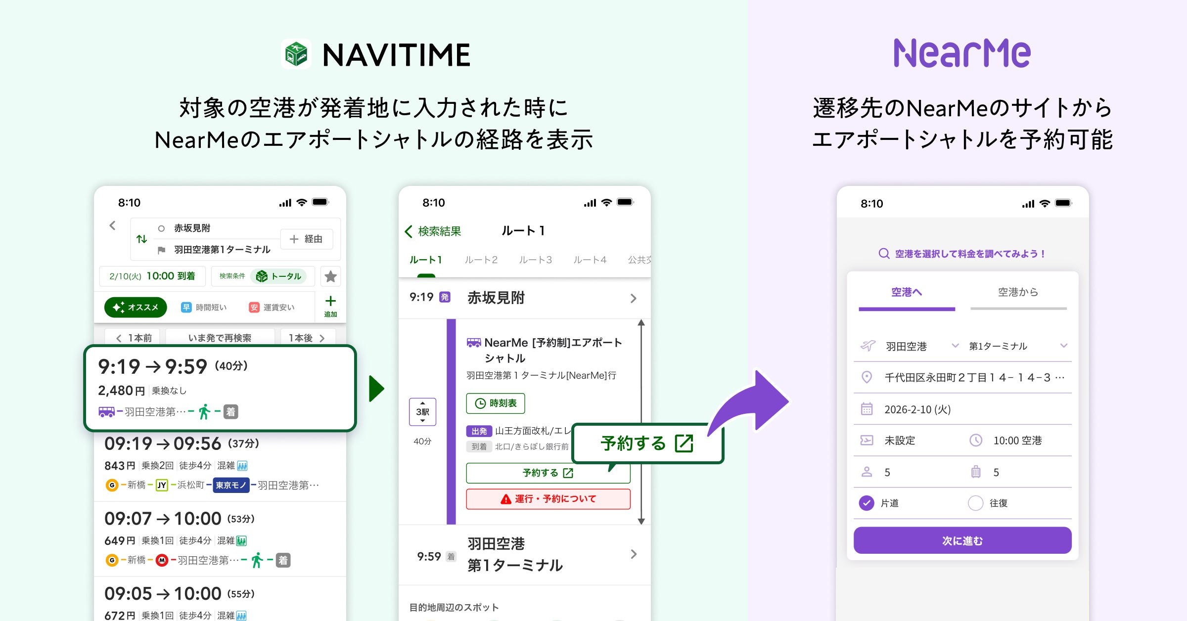 本連携により、『NAVITIME』アプリにて赤坂見附および笹塚と羽田空港を結ぶルートを検索すると、ニアミーが提供する『エアポートシャトル』を利用するルートが表示されます。また、羽田空港・成田空港・関西国際空港・大阪(伊丹)空港の4空港を発着地とするルート検索時には、検索結果画面からニアミーの予約サイトへ遷移し、そのまま予約を行うことができます。