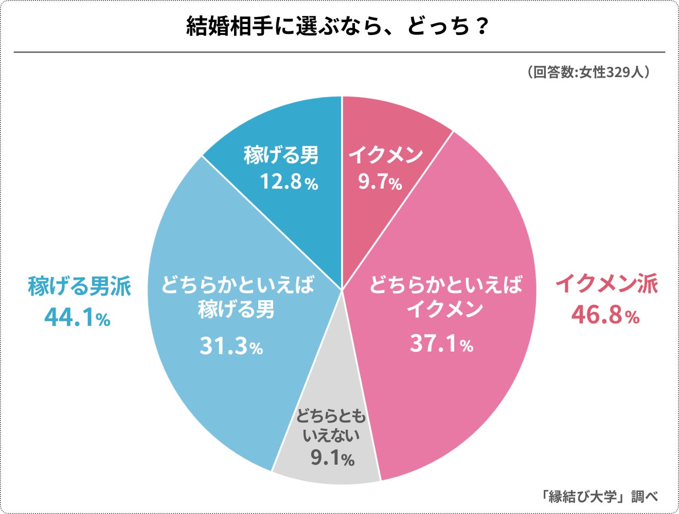 329人の成人女性に、結婚するなら「稼ぎが良くてお金に困らず暮らせるけれど家事育児にはノータッチの男性」か「年収が少な目でながらも家事・育児ができるイクメン」のどちらがよいかを尋ねた結果、以下のように意見は2つに分かれました。