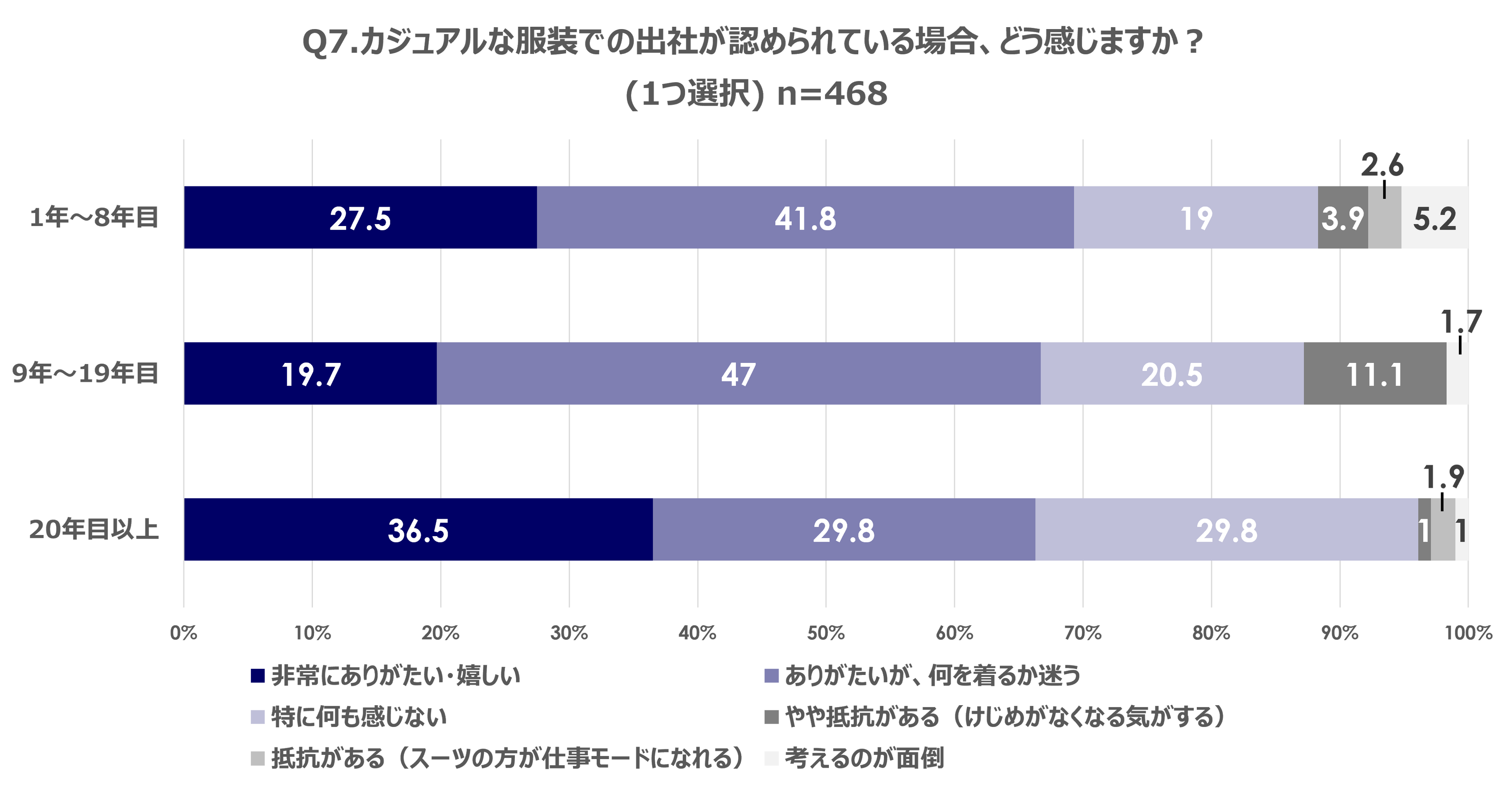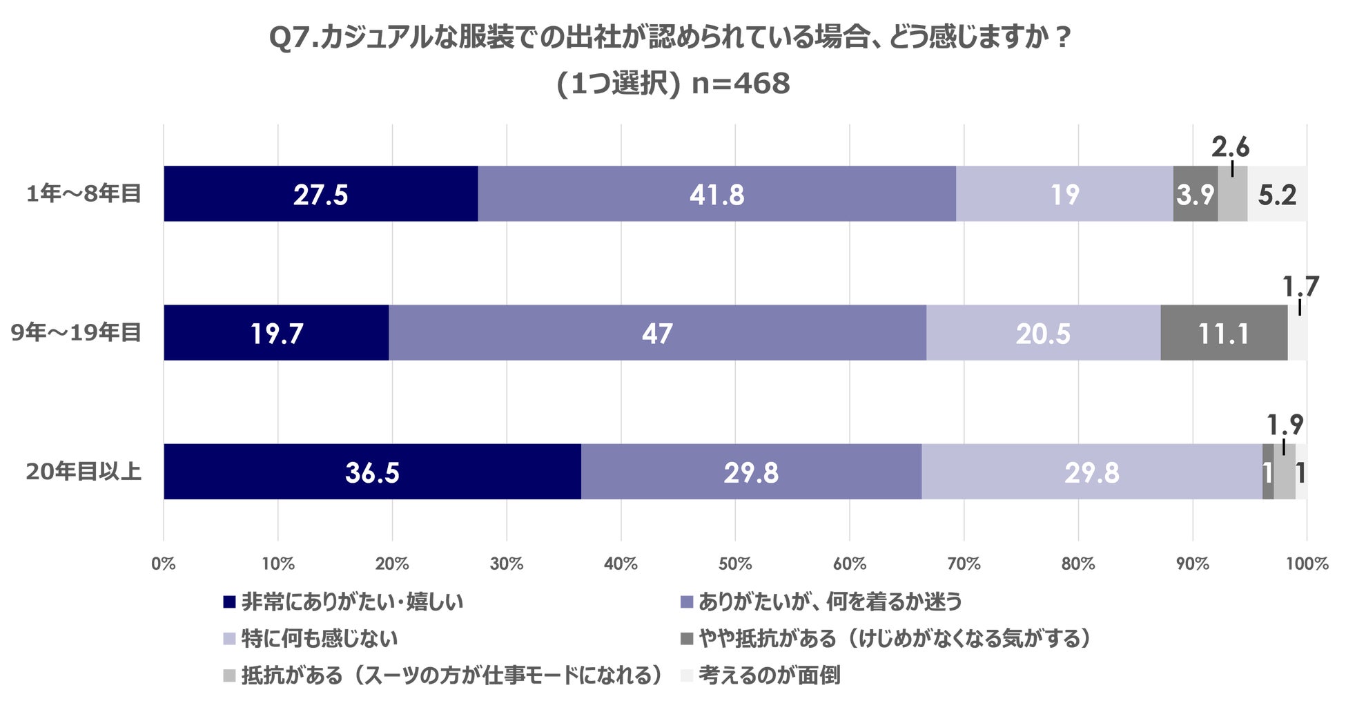 20年目以上は”非常ありがたい”・”嬉しい”の割合が高い=自分が着たいものを着たい、もしくは固い格好をしたくない。一方で、9年~19年目、1年~8年目は”迷う”や”抵抗がある”等のマイナスのイメージが強い結果になりました。